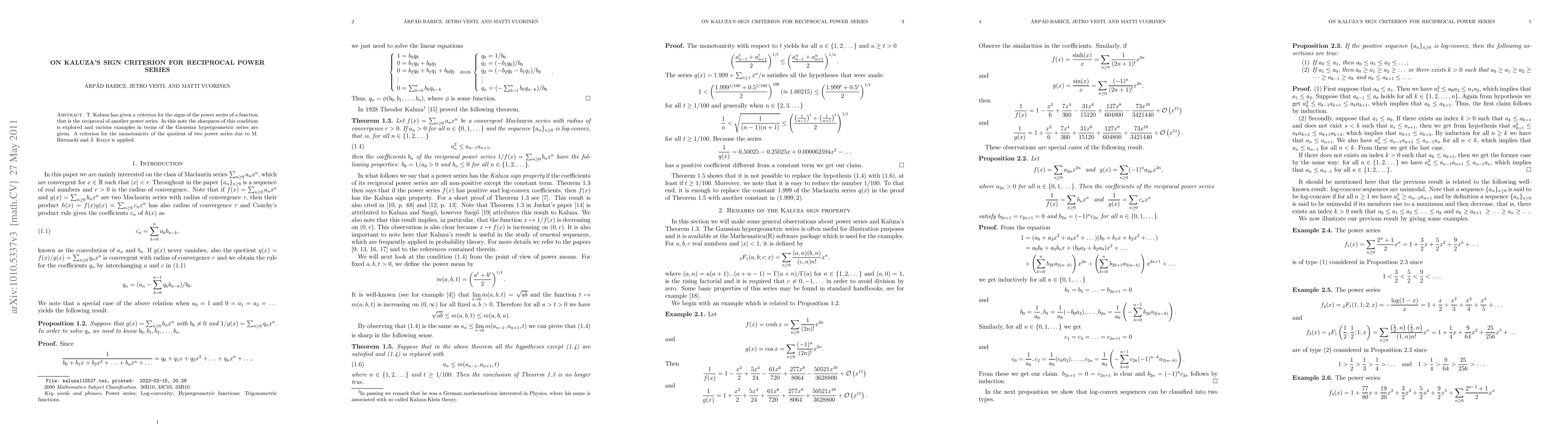T. Kaluza has given a criterion for the signs of the power series of a function that is the reciprocal of another power series. In this note the sharpness of this condition is explored and various examples in terms of the Gaussian hypergeometric series are given. A criterion for the monotonicity of the quotient of two power series due to M. Biernacki and J. Krzy\.z is applied.
