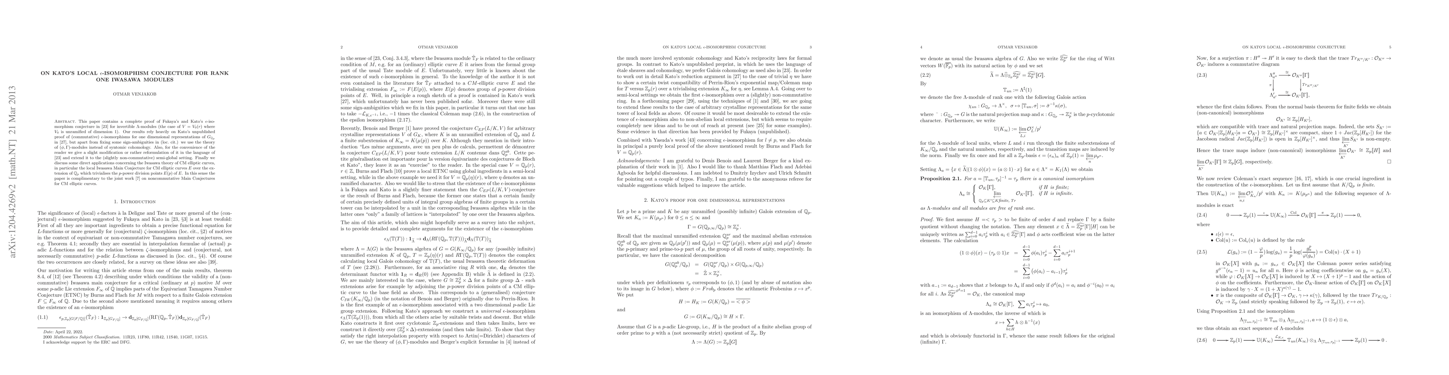 This paper contains a complete proof of Fukaya's and Kato's epsilon$-isomorphism conjecture in [23] for invertible \Lambda-modules (the case of V = V_0(r) where V_0 is unramified of dimension 1). Our results rely heavily on Kato's unpublished proof of (commutative) epsilon-isomorphisms for one dimensional representations of G_{Q_p} in [27], but apart from fixing some sign-ambiguities in (loc.\ cit.) we use the theory of (\phi,\Gamma)-modules instead of syntomic cohomology. Also, for the convenience of the reader we give a slight modification or rather reformulation of it in the language of [23] and extend it to the (slightly non-commutative) semi-global setting. Finally we discuss some direct applications concerning the Iwasawa theory of CM elliptic curves, in particular the local Iwasawa Main Conjecture for CM elliptic curves E over the extension of Q_p which trivialises the p-power division points E(p) of E. In this sense the paper is complimentary to the joint work [7] on noncommutative Main Conjectures for CM elliptic curves.