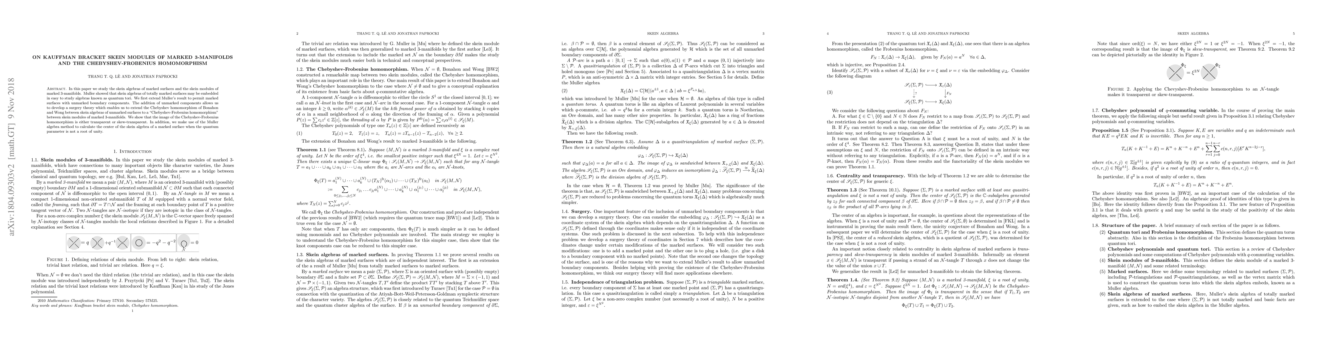 In this paper we study the skein algebras of marked surfaces and the skein modules of marked 3-manifolds. Muller showed that skein algebras of totally marked surfaces may be embedded in easy to study algebras known as quantum tori. We first extend Muller's result to permit marked surfaces with unmarked boundary components. The addition of unmarked components allows us to develop a surgery theory which enables us to extend the Chebyshev homomorphism of Bonahon and Wong between skein algebras of unmarked surfaces to a "Chebyshev-Frobenius homomorphism" between skein modules of marked 3-manifolds. We show that the image of the Chebyshev-Frobenius homomorphism is either transparent or skew-transparent. In addition, we make use of the Muller algebra method to calculate the center of the skein algebra of a marked surface when the quantum parameter is not a root of unity.