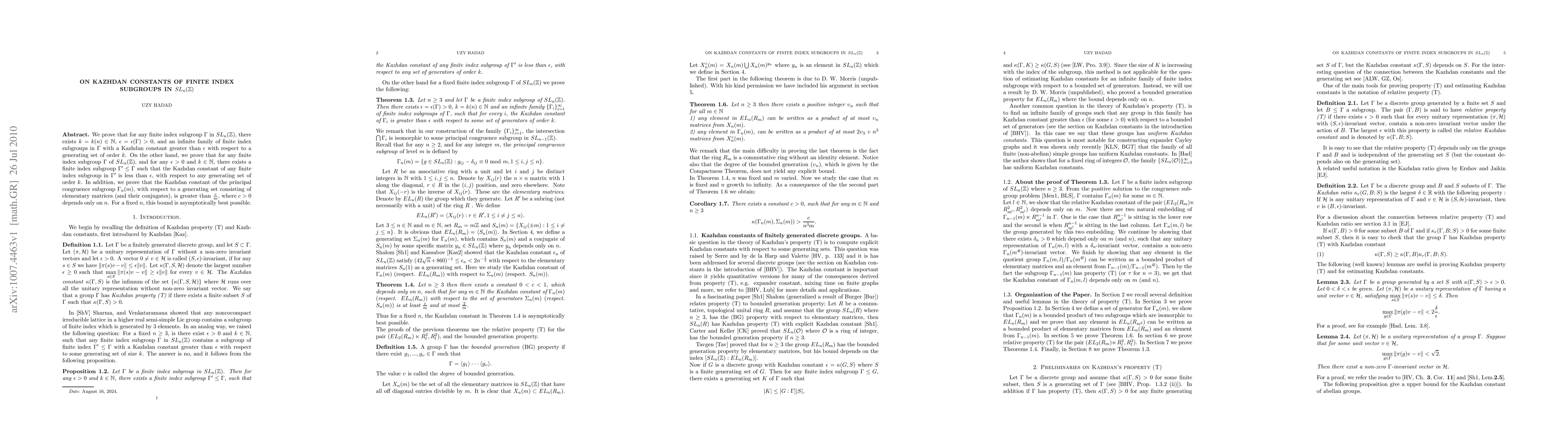 This paper establishes the existence and bounds of Kazhdan constants for finite index subgroups in $SL_n(\mathbb{Z})$. It proves the presence of subgroups with large Kazhdan constants and conversely, the existence of subgroups with arbitrarily small Kazhdan constants.