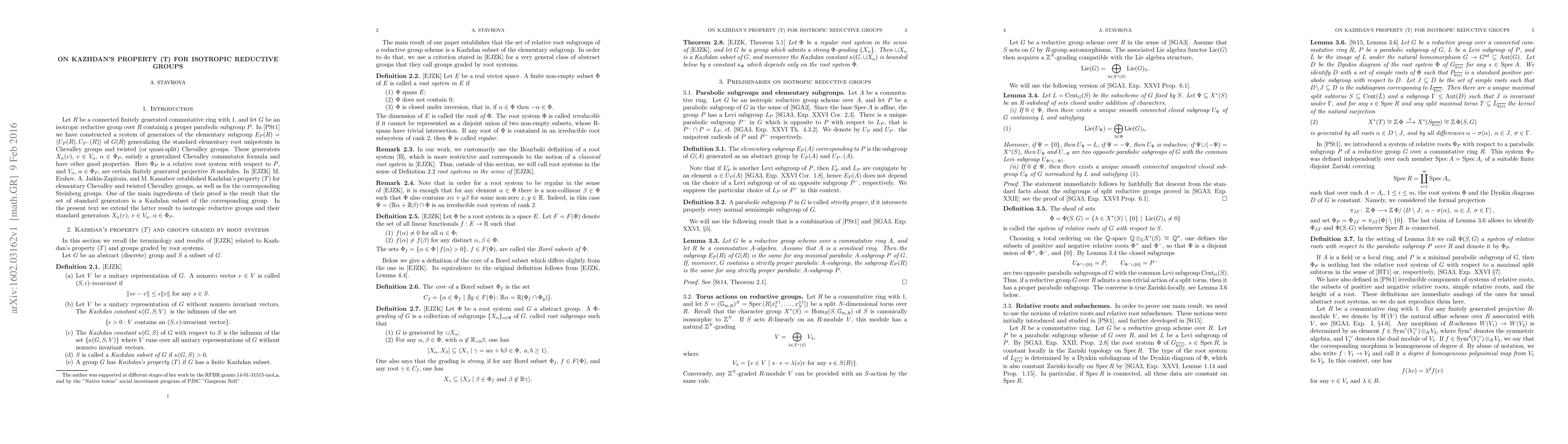 Summary: This paper demonstrates that the standard generators of elementary isotropic reductive groups over a connected finitely generated ring form a Kazhdan subset, extending previous results for Chevalley and twisted Chevalley groups. The findings generalize the work of M. Ershov, A. Jaikin-Zapirain, and M. Kassabov.