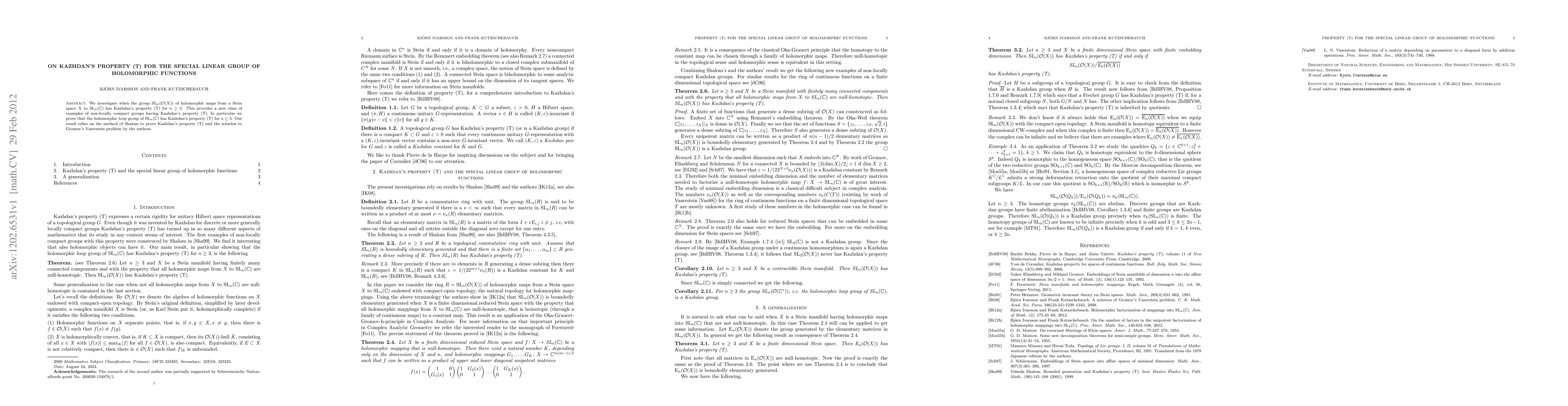 Summary: This paper explores when the special linear group of holomorphic functions, $SL_n(\mathcal{O}(X))$, possesses Kazhdan's property (T) for $n\ge 3$. It establishes that the holomorphic loop group of $SL_n (\C)$ has this property, presenting a new class of non-locally compact groups with Kazhdan's property (T), based on Shalom's method and Gromov's Vasestein problem solution.