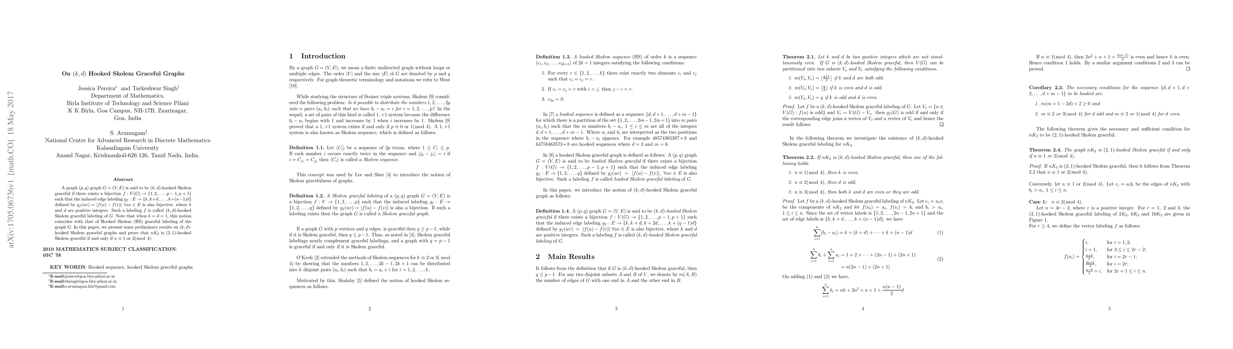 This paper explores the concept of $(k, d)$-hooked Skolem graceful graphs, where a graph $G$ is labeled such that both vertex and edge labels are bijective under specific conditions. The authors prove that the complete graph $nK_2$ is $(2, 1)$-hooked Skolem graceful if and only if $n$ is congruent to 1 or 2 modulo 4.