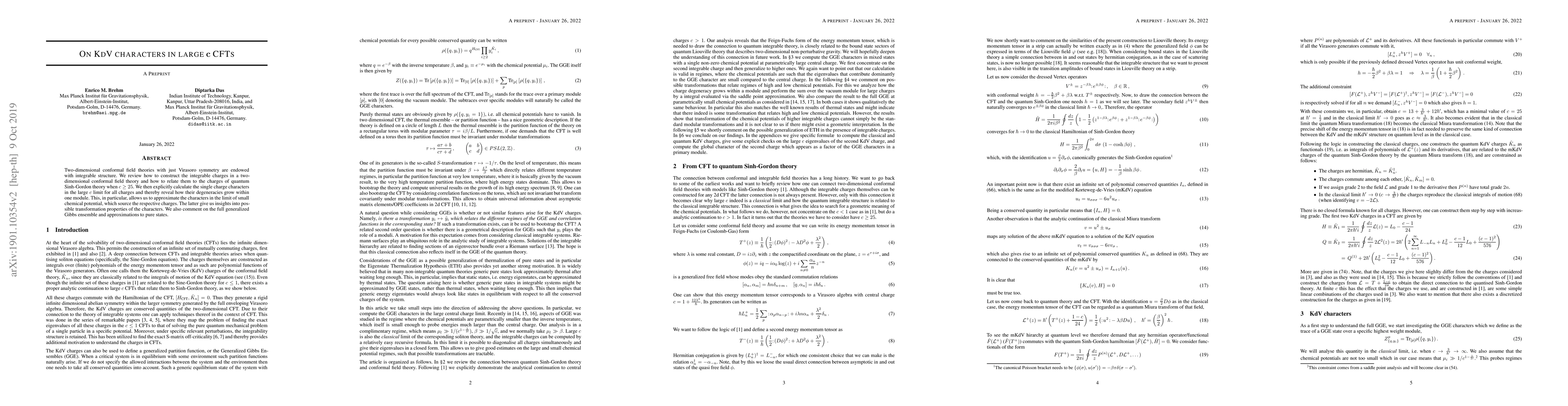 Two-dimensional conformal field theories with just Virasoro symmetry are endowed with integrable structure. We review how to construct the integrable charges in a two-dimensional conformal field theory and how to relate them to the charges of quantum Sinh-Gordon theory when c>25. We then explicitly calculate the single charge characters in the large c limit for all charges and thereby reveal how their degeneracies grow within one module. This, in particular, allows us to approximate the characters in the limit of small chemical potential, which source the respective charges. The latter give us insights into possible transformation properties of the characters. We also comment on the full generalized Gibbs ensemble and approximations to pure states.