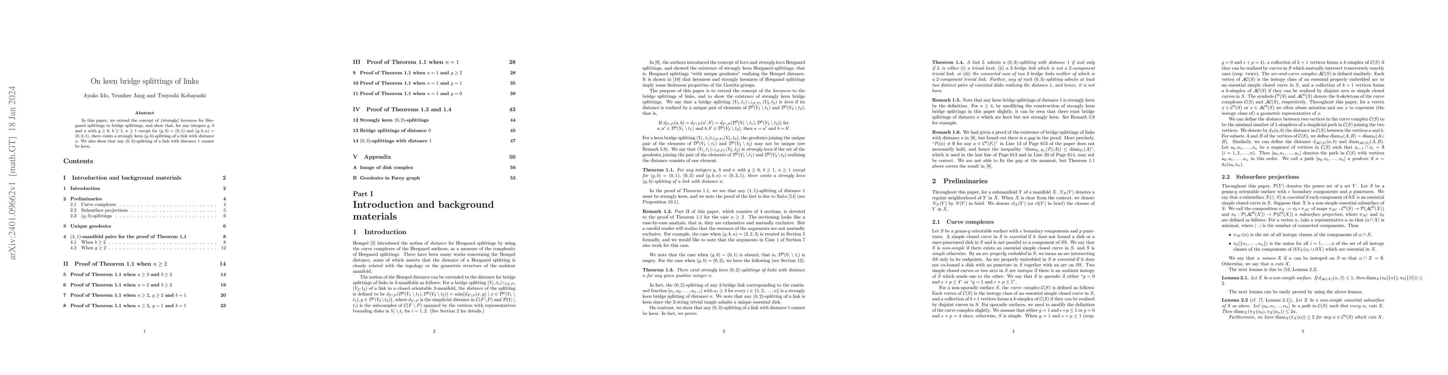 This paper introduces the concept of strongly keen bridge splittings for links, demonstrating the existence of such splittings for specific combinations of parameters except for some exceptions. It concludes by proving that a particular $(0,3)$-splitting with distance $1$ cannot be keen.