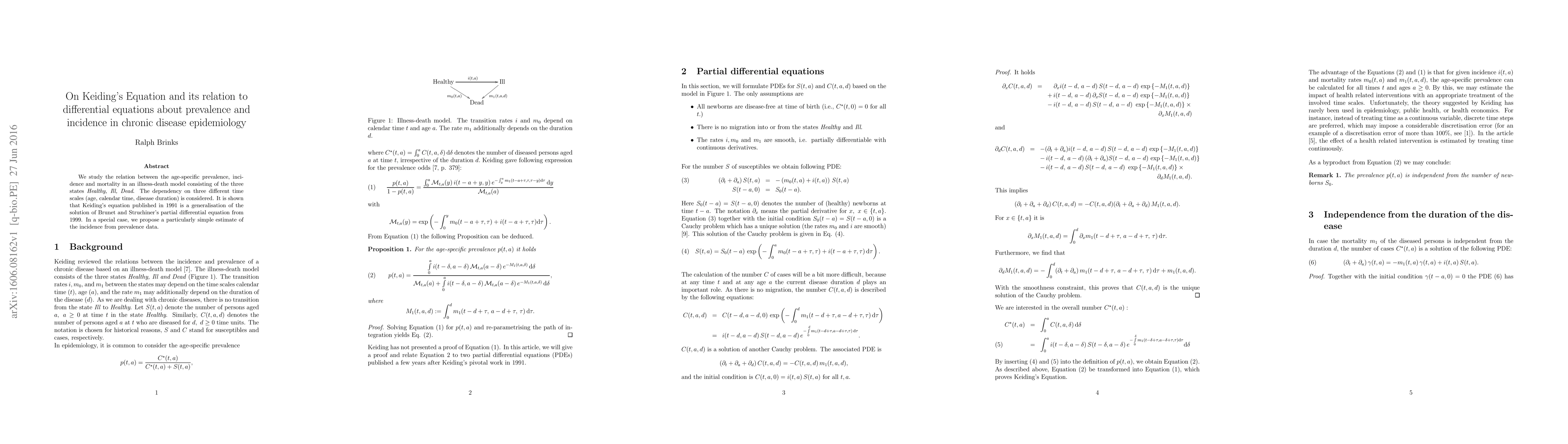 We study the relation between the age-specific prevalence, incidence and mortality in an illness-death model consisting of the three states Healthy, Ill, Dead. The dependency on three different time scales (age, calendar time, disease duration) is considered. It is shown that Keiding's equation published in 1991 is a generalisation of the solution of Brunet and Struchiner's partial differential equation from 1999. In a special case, we propose a particularly simple estimate of the incidence from prevalence data.