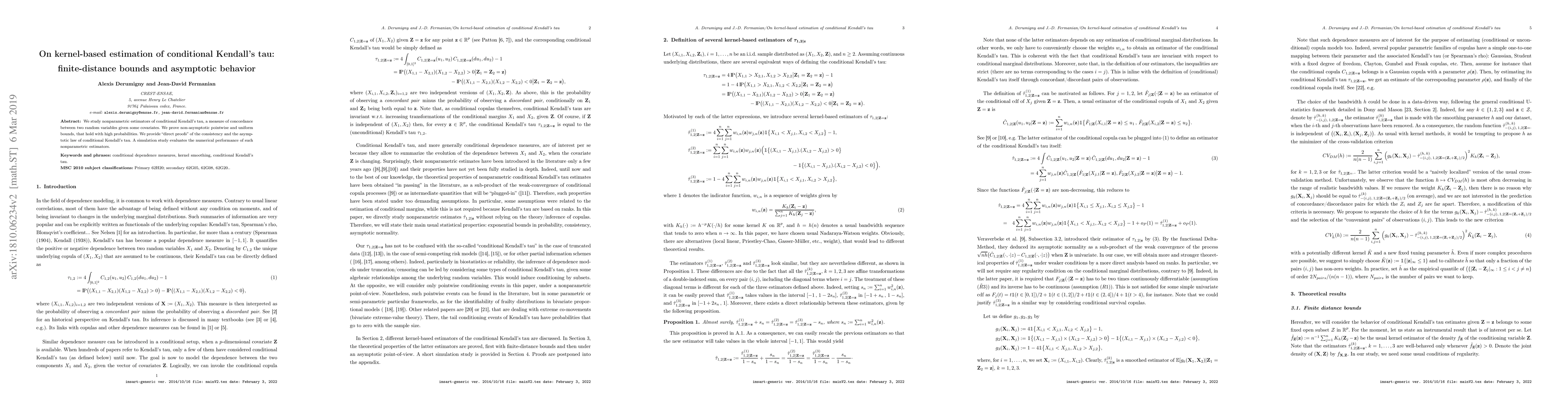 This paper investigates nonparametric estimators for conditional Kendall's tau, providing finite-distance bounds and proving consistency with explicit constants. A simulation study assesses the practical performance of these estimators.