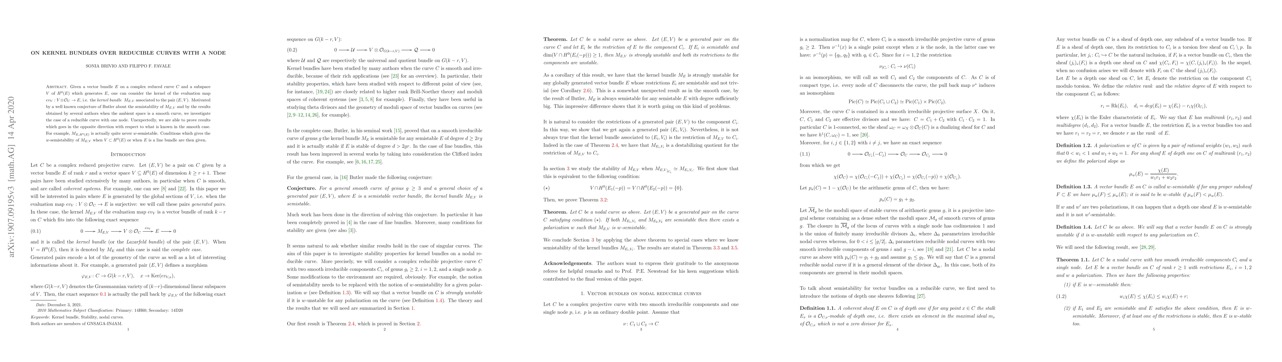 This paper investigates kernel bundles over reducible curves with a node, challenging a known conjecture about their semistability. Contrary to expectations from smooth curve cases, these bundles are found to be rarely semistable. The study provides conditions for the semistability of such kernel bundles under specific circumstances.