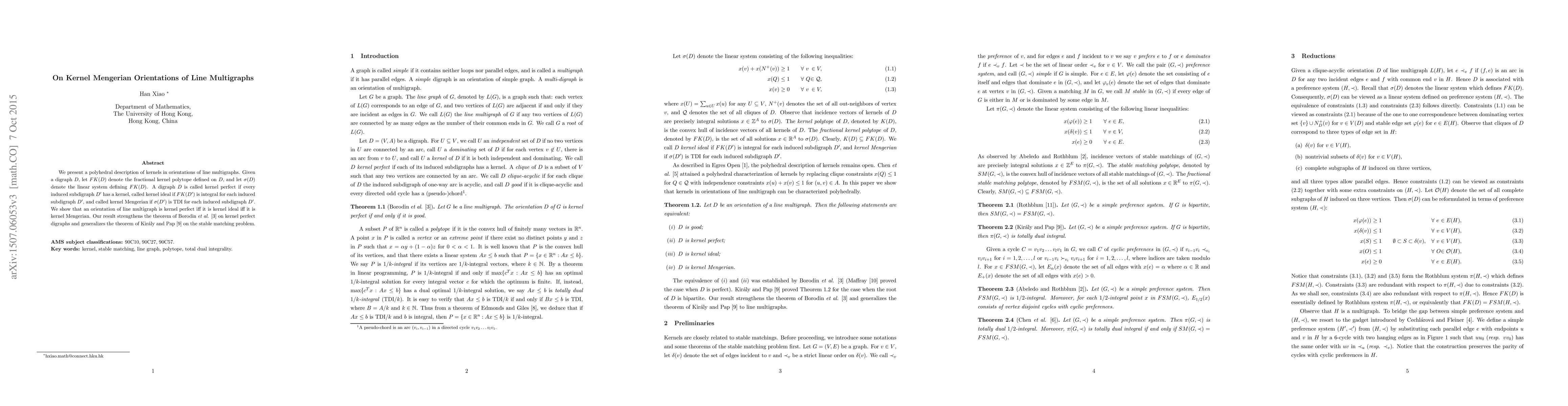 We present a polyhedral description of kernels in orientations of line multigraphs. Given a digraph $D$, let $FK(D)$ denote the fractional kernel polytope defined on $D$, and let ${\sigma}(D)$ denote the linear system defining $FK(D)$. A digraph $D$ is called kernel perfect if every induced subdigraph $D^\prime$ has a kernel, called kernel ideal if $FK(D^\prime)$ is integral for each induced subdigraph $D^\prime$, and called kernel Mengerian if ${\sigma} (D^\prime)$ is TDI for each induced subdigraph $D^\prime$. We show that an orientation of a line multigraph is kernel perfect iff it is kernel ideal iff it is kernel Mengerian. Our result strengthens the theorem of Borodin et al. [3] on kernel perfect digraphs and generalizes the theorem of Kiraly and Pap [7] on stable matching problem.