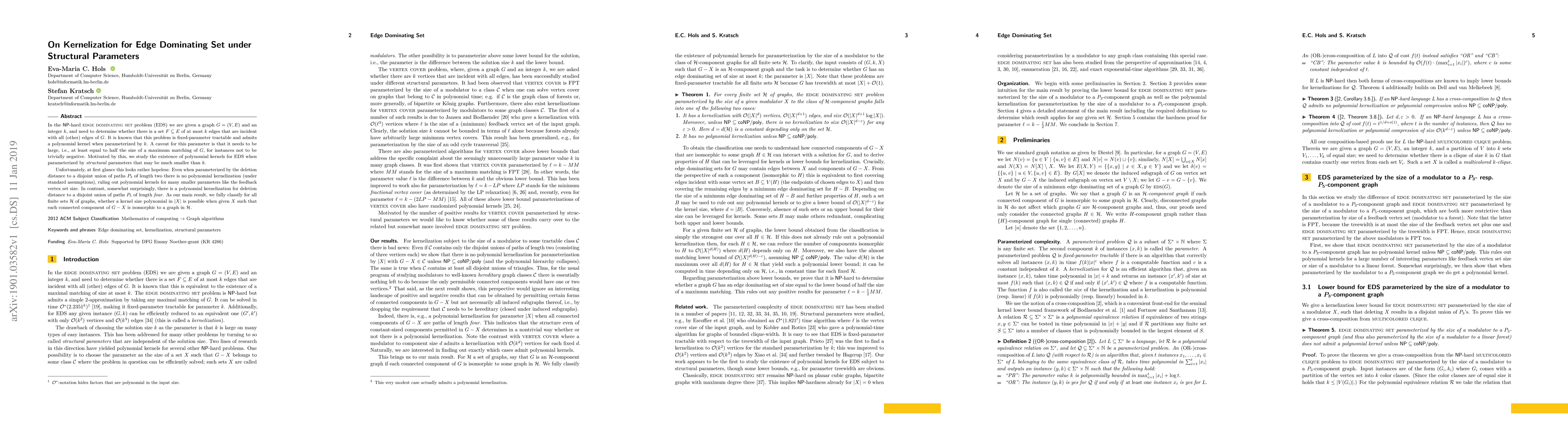 The research paper investigates the kernelization of the Edge Dominating Set (EDS) problem under various structural parameters. While no polynomial kernel exists for many small parameters like feedback vertex set size, there is a surprising polynomial kernel for instances parameterized by the deletion distance to a disjoint union of paths $P_5$ of length four. The main result classifies whether a polynomial kernel can be achieved for different graph sets $\mathcal{H}$.
