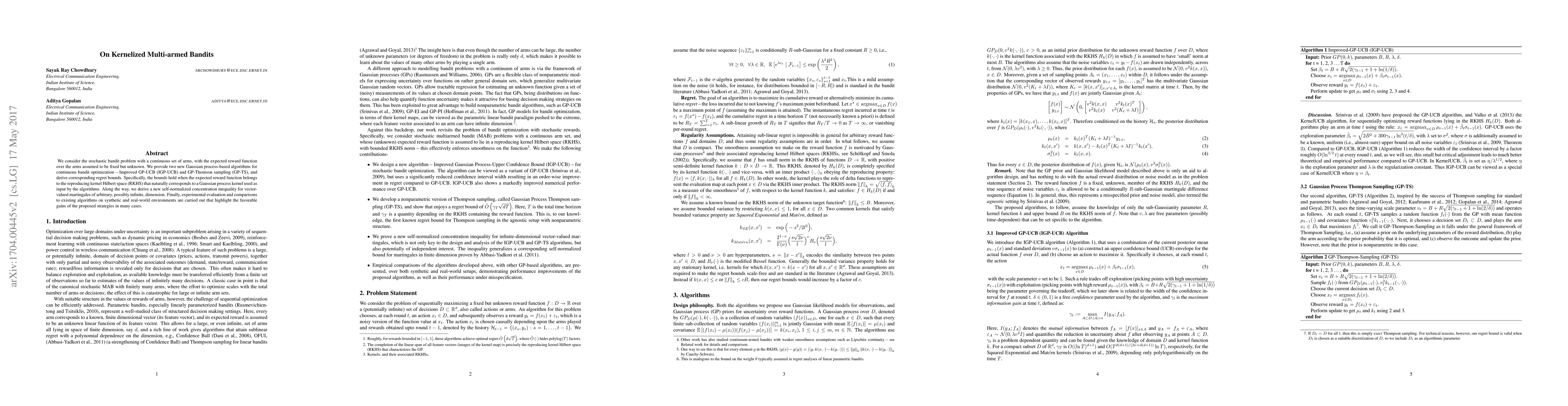 We consider the stochastic bandit problem with a continuous set of arms, with the expected reward function over the arms assumed to be fixed but unknown. We provide two new Gaussian process-based algorithms for continuous bandit optimization-Improved GP-UCB (IGP-UCB) and GP-Thomson sampling (GP-TS), and derive corresponding regret bounds. Specifically, the bounds hold when the expected reward function belongs to the reproducing kernel Hilbert space (RKHS) that naturally corresponds to a Gaussian process kernel used as input by the algorithms. Along the way, we derive a new self-normalized concentration inequality for vector- valued martingales of arbitrary, possibly infinite, dimension. Finally, experimental evaluation and comparisons to existing algorithms on synthetic and real-world environments are carried out that highlight the favorable gains of the proposed strategies in many cases.
