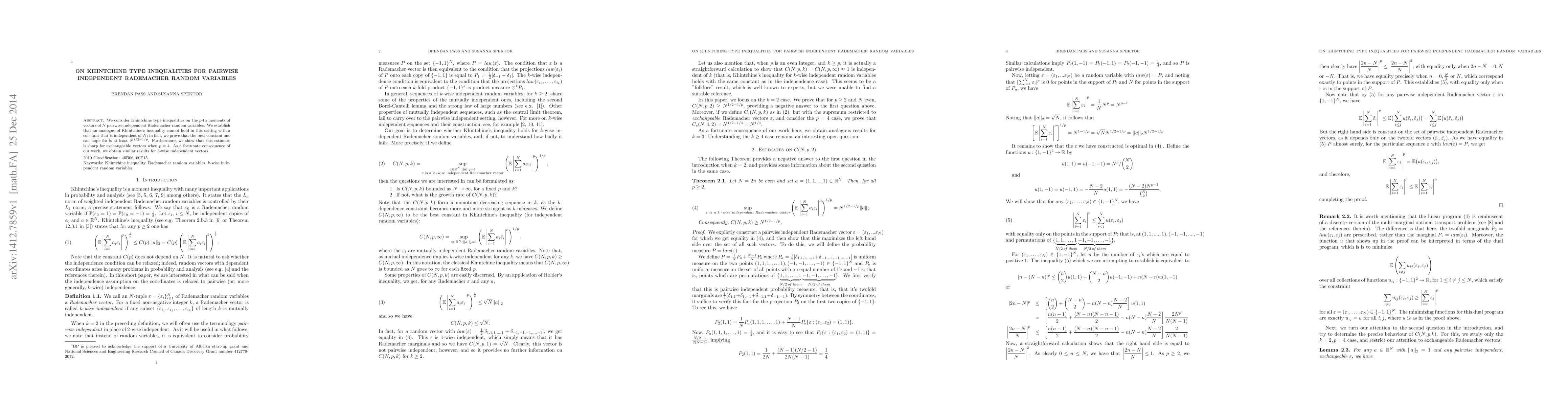 This paper investigates Khintchine type inequalities for $p$-th moments of pairwise independent Rademacher random variables, proving that no universal constant exists for these inequalities, with the best achievable constant being $N^{1/2-1/p}$. The authors demonstrate that this estimate is tight for exchangeable vectors when $p=4$ and extend their findings to $3$-wise independent vectors.