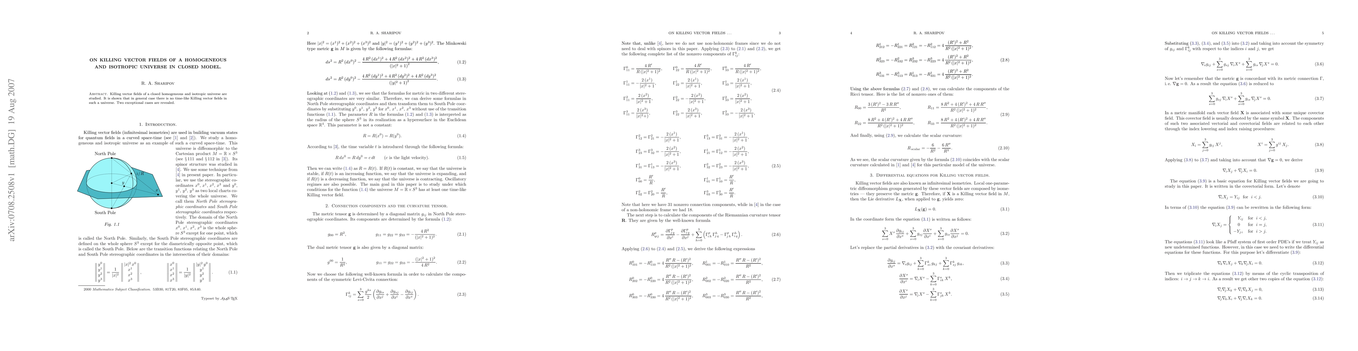 Summary: This paper investigates Killing vector fields in a closed, homogeneous, and isotropic universe, demonstrating the absence of time-like Killing vector fields in general, with two specific exceptional cases identified where such fields do exist.