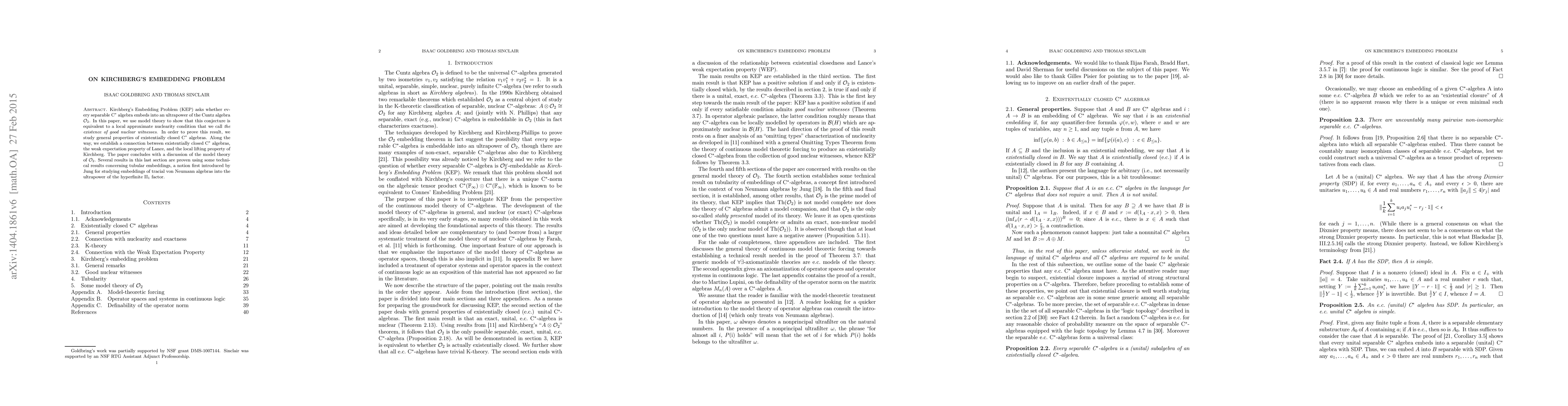 Kirchberg's Embedding Problem (KEP) asks whether every separable C$^*$ algebra embeds into an ultrapower of the Cuntz algebra $\mathcal{O}_2$. In this paper, we use model theory to show that this conjecture is equivalent to a local approximate nuclearity condition that we call the existence of good nuclear witnesses. In order to prove this result, we study general properties of existentially closed C$^*$ algebras. Along the way, we establish a connection between existentially closed C$^*$ algebras, the weak expectation property of Lance, and the local lifting property of Kirchberg. The paper concludes with a discussion of the model theory of $\mathcal{O}_2$. Several results in this last section are proven using some technical results concerning tubular embeddings, a notion first introduced by Jung for studying embeddings of tracial von Neumann algebras into the ultrapower of the hyperfinite II$_1$ factor.