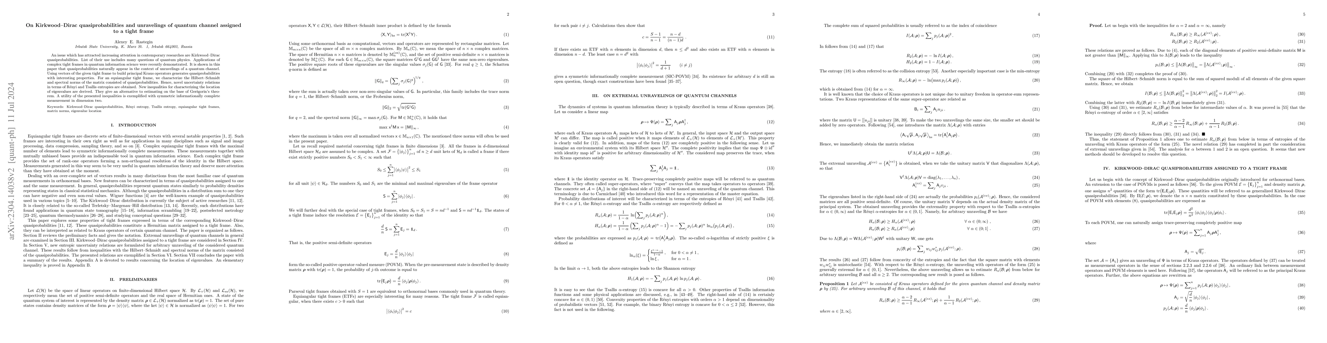 This paper explores Kirkwood-Dirac quasiprobabilities in the context of unraveling quantum channels and their relation to tight frames. It characterizes the Hilbert-Schmidt and spectral norms of the matrix derived from equiangular tight frames, formulating uncertainty relations in terms of Rényi and Tsallis entropies and deriving new eigenvalue location inequalities.