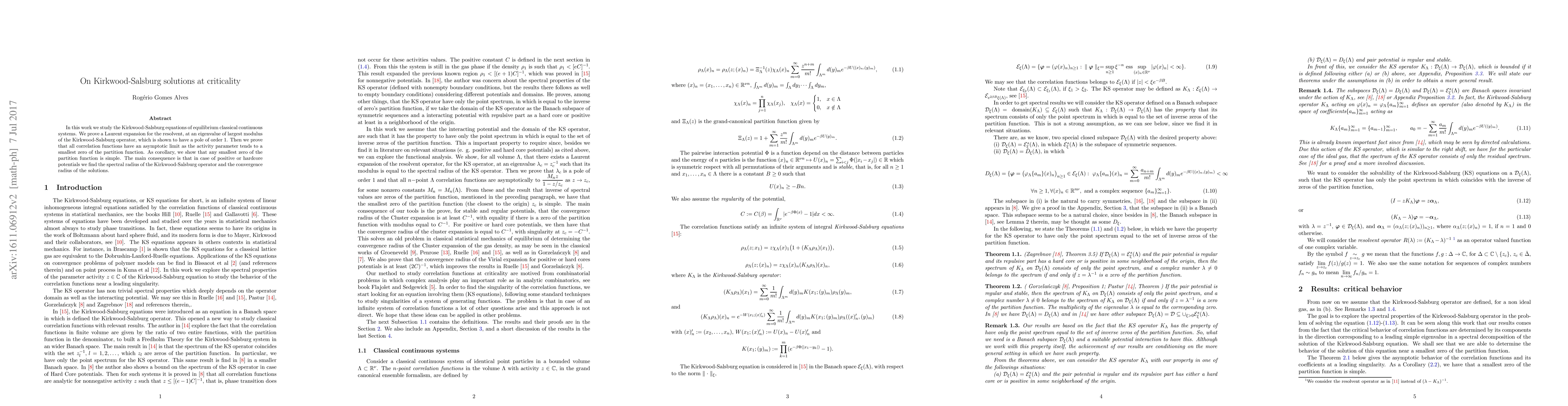 In this work we study the Kirkwood-Salsburg equations of equilibrium classical continuous systems. We prove a Laurent expansion for the resolvent, at an eigenvalue of largest modulus of the Kirkwood-Salsburg operator, which is shown to have a pole of order 1. Then we prove that all correlation functions have an asymptotic limit as the activity parameter tends to a smallest zero of the partition function. As corollary, we show that any smallest zero of the partition function is simple. The main consequence is that in case of positive or hardcore potentials we find the spectral radius of the Kirkwood-Salsburg operator and the convergence radius of the solutions.