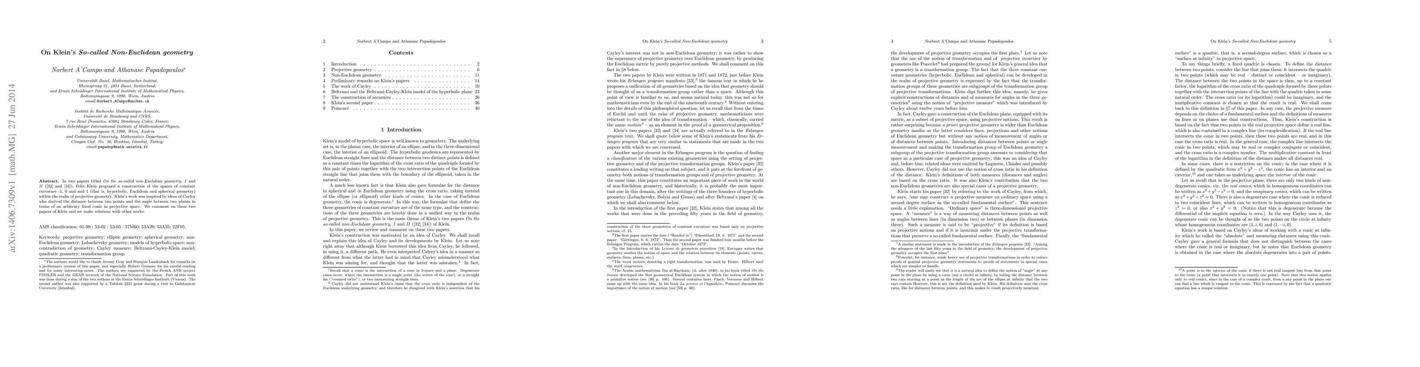 Summary: Felix Klein proposed a construction of hyperbolic, Euclidean, and spherical geometries within projective geometry, inspired by Cayley's ideas, and this work laid foundational connections to other mathematical studies. Klein's two papers on non-Euclidean geometry are analyzed and related to subsequent mathematical developments.