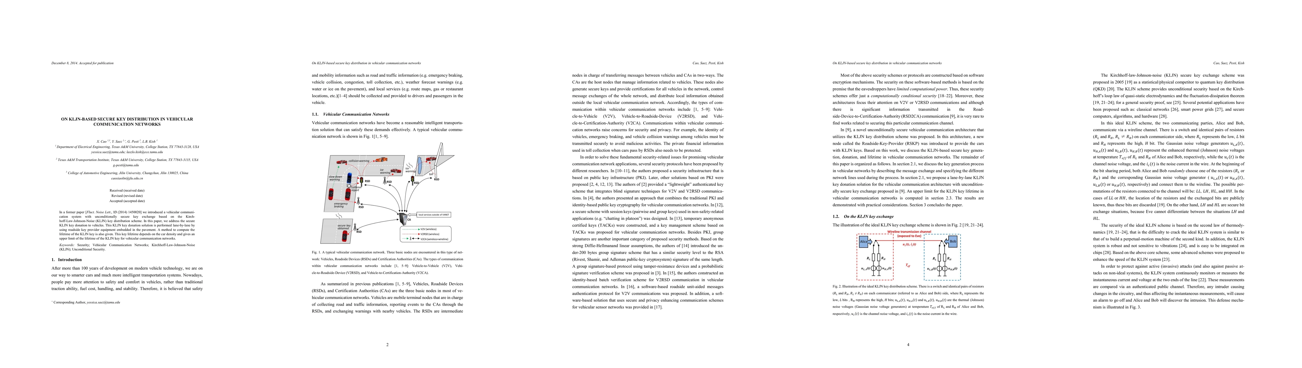 This paper extends a vehicular communication system with an unconditionally secure key distribution method based on the KLJN scheme, introducing a lane-by-lane key donation solution using roadside equipment embedded in the pavement. It also provides a method to compute the KLJN key's lifetime, which is influenced by car density and sets an upper limit for secure vehicular communication.