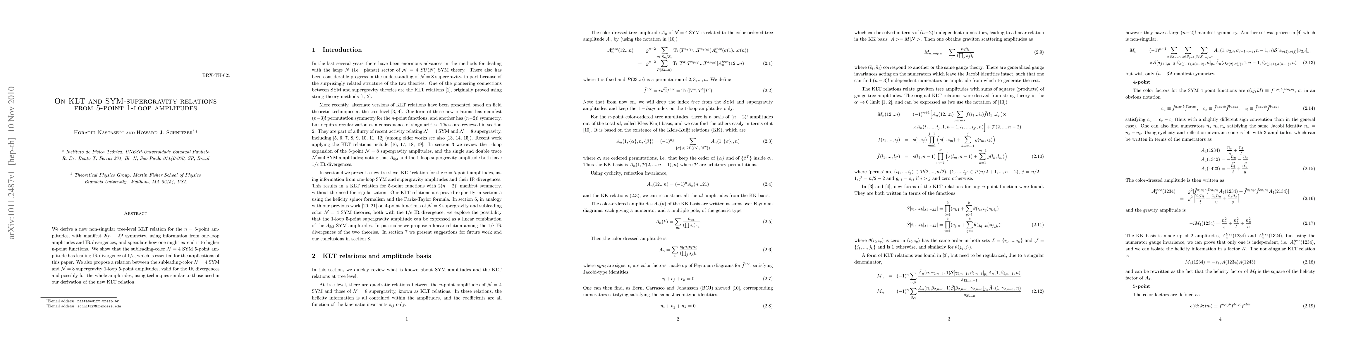 We derive a new non-singular tree-level KLT relation for the $n=5$-point amplitudes, with manifest $2(n-2)!$ symmetry, using information from one-loop amplitudes and IR divergences, and speculate how one might extend it to higher n-point functions. We show that the subleading-color ${\cal N}=4$ SYM 5-point amplitude has leading IR divergence of $1/\epsilon$, which is essential for the applications of this paper. We also propose a relation between the subleading-color ${\cal N}=4$ SYM and ${\cal N}=8$ supergravity 1-loop 5-point amplitudes, valid for the IR divergences and possibly for the whole amplitudes, using techniques similar to those used in our derivation of the new KLT relation.