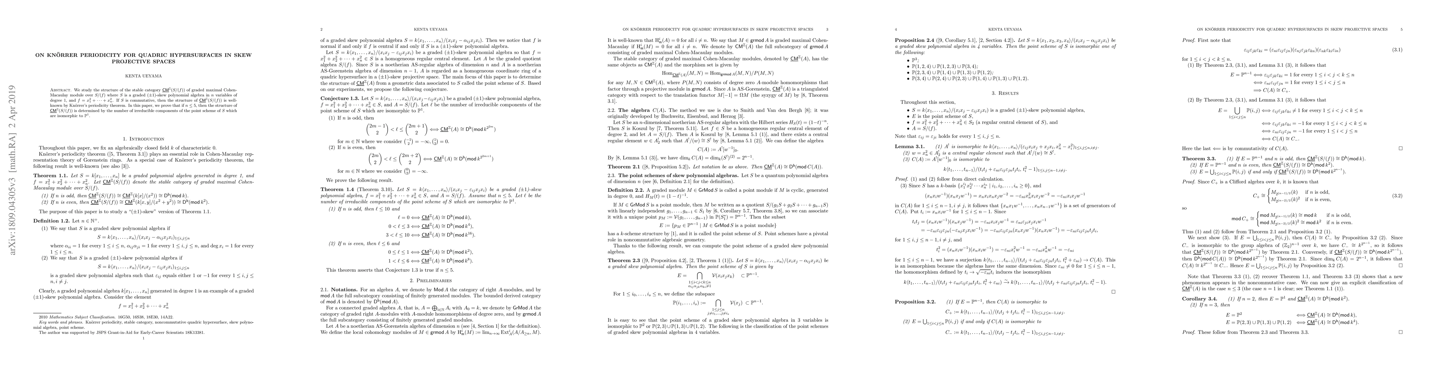 We study the structure of the stable category $\mathsf{\underline{CM}}^{\mathbb Z}(S/(f))$ of graded maximal Cohen-Macaulay module over $S/(f)$ where $S$ is a graded ($\pm 1$)-skew polynomial algebra in $n$ variables of degree 1, and $f =x_1^2 + \cdots +x_n^2$. If $S$ is commutative, then the structure of $\mathsf{\underline{CM}}^{\mathbb Z}(S/(f))$ is well-known by Kn\"orrer's periodicity theorem. In this paper, we prove that if $n\leq 5$, then the structure of $\mathsf{\underline{CM}}^{\mathbb Z}(S/(f))$ is determined by the number of irreducible components of the point scheme of $S$ which are isomorphic to ${\mathbb P}^1$.