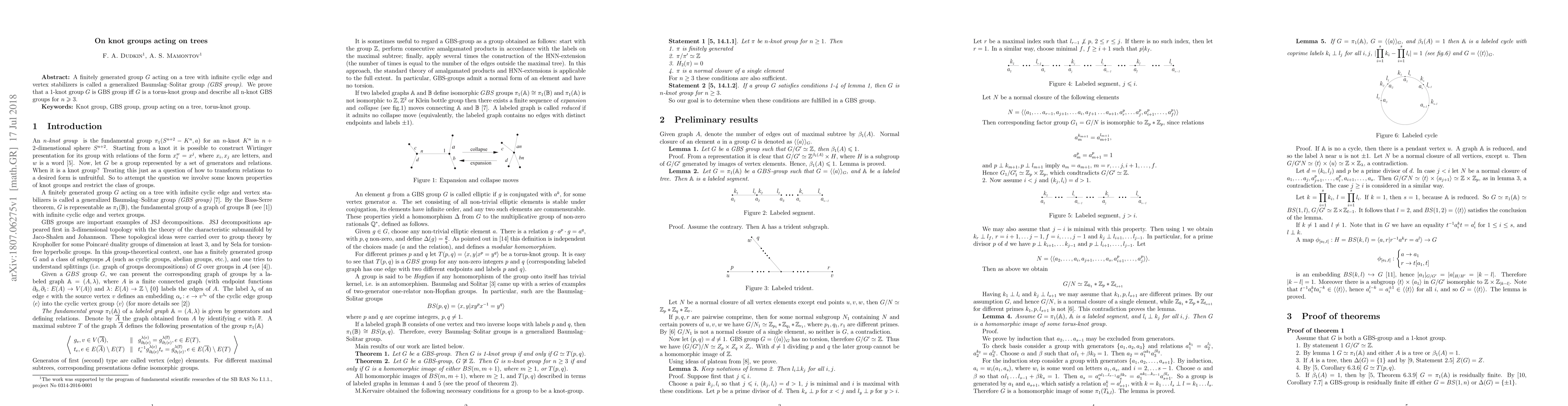 A finitely generated group $G$ acting on a tree with infinite cyclic edge and vertex stabilizers is called a generalized Baumslag--Solitar group ($GBS$ group). We prove that a 1-knot group $G$ is $GBS$ group iff $G$ is a torus-knot group and describe all n-knot GBS groups for $n\geqslant 3$.