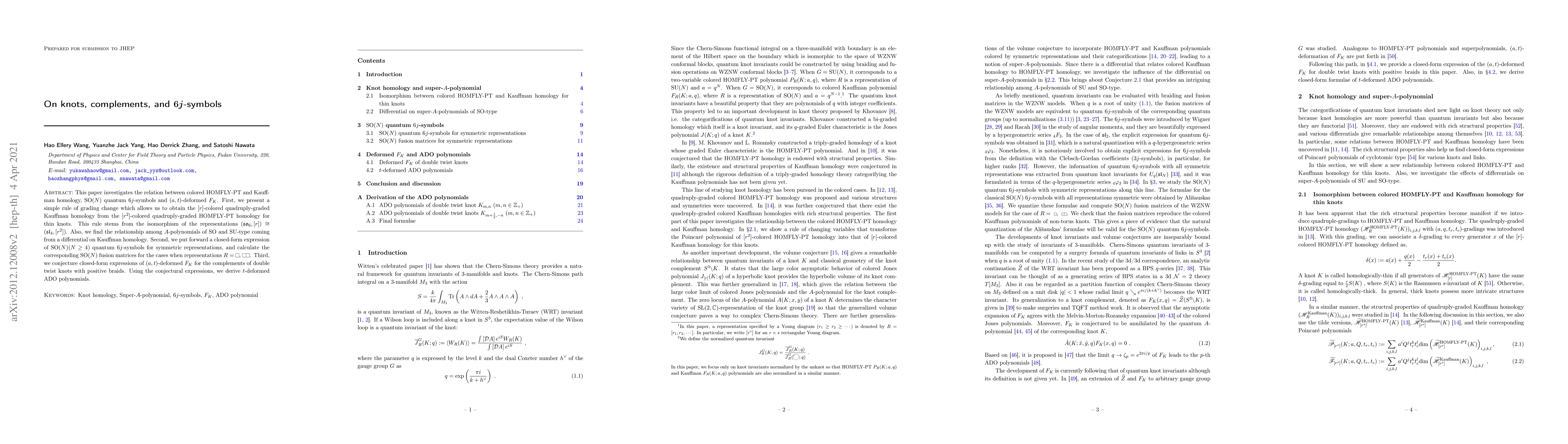 This paper investigates the relation between colored HOMFLY-PT and Kauffman homology, $\text{SO}(N)$ quantum $6j$-symbols and $(a,t)$-deformed $F_K$. First, we present a simple rule of grading change which allows us to obtain the $[r]$-colored quadruply-graded Kauffman homology from the $[r^2]$-colored quadruply-graded HOMFLY-PT homology for thin knots. This rule stems from the isomorphism of the representations $(\mathfrak{so}_6,[r]) \cong (\mathfrak{sl}_4,[r^2])$. Also, we find the relationship among $A$-polynomials of SO and SU-type coming from a differential on Kauffman homology. Second, we put forward a closed-form expression of $\text{SO}(N)(N\geq 4)$ quantum $6j$-symbols for symmetric representations, and calculate the corresponding $\text{SO}(N)$ fusion matrices for the cases when representations $R = [1],[2]$. Third, we conjecture closed-form expressions of $(a,t)$-deformed $F_K$ for the complements of double twist knots with positive braids. Using the conjectural expressions, we derive $t$-deformed ADO polynomials.