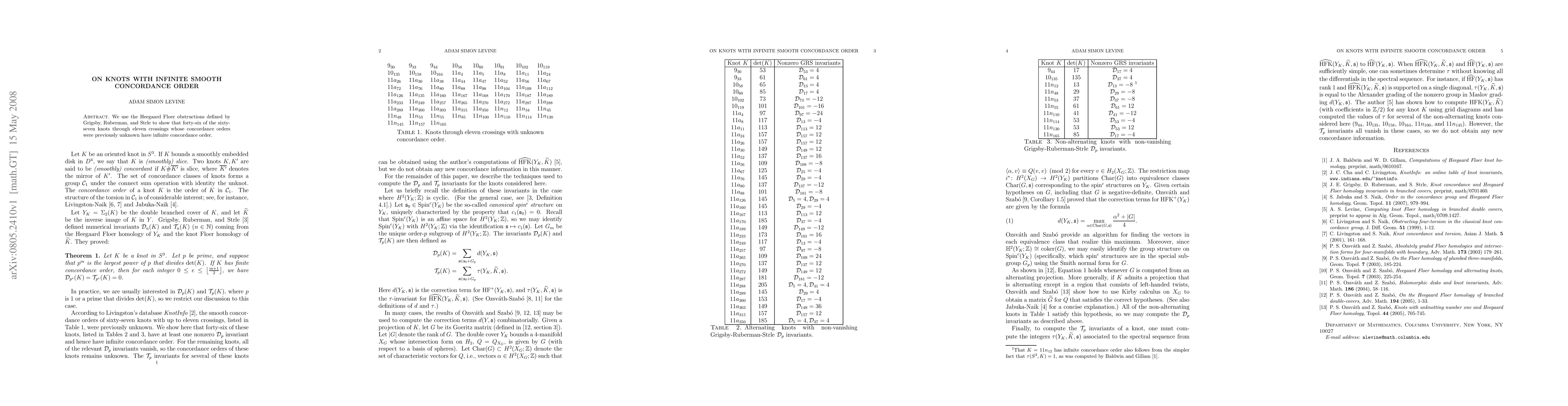 We use the Heegaard Floer obstructions defined by Grigsby, Ruberman, and Strle to show that forty-six of the sixty-seven knots through eleven crossings whose concordance orders were previously unknown have infinite concordance order.