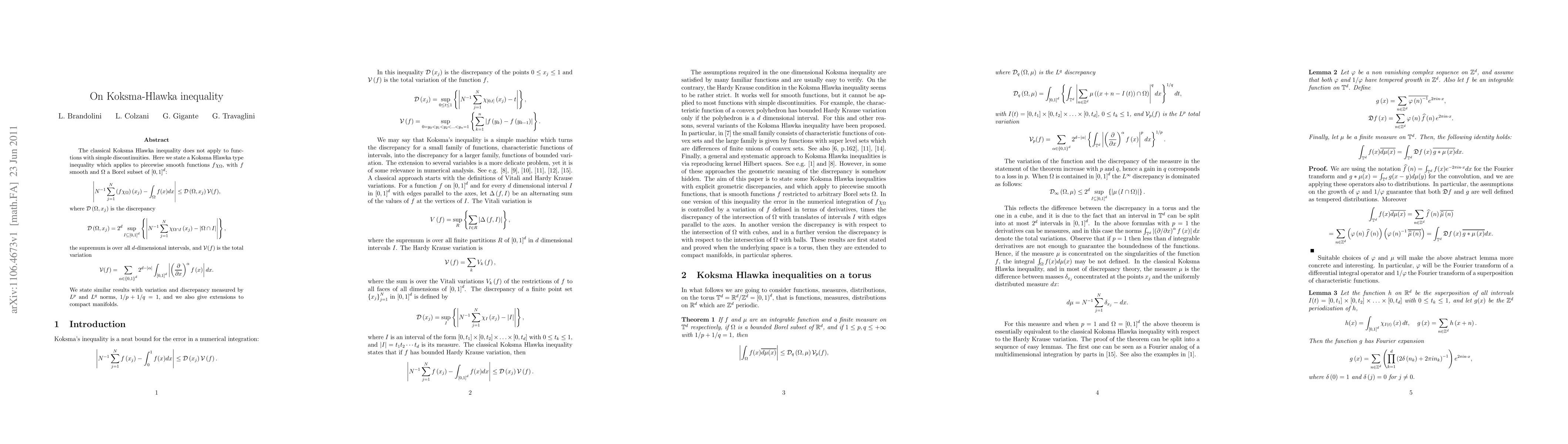 The classical Koksma Hlawka inequality does not apply to functions with simple discontinuities. Here we state a Koksma Hlawka type inequality which applies to piecewise smooth functions $f\chi_{\Omega}$, with $f$ smooth and $\Omega $ a Borel subset of $[0,1]^{d}$.