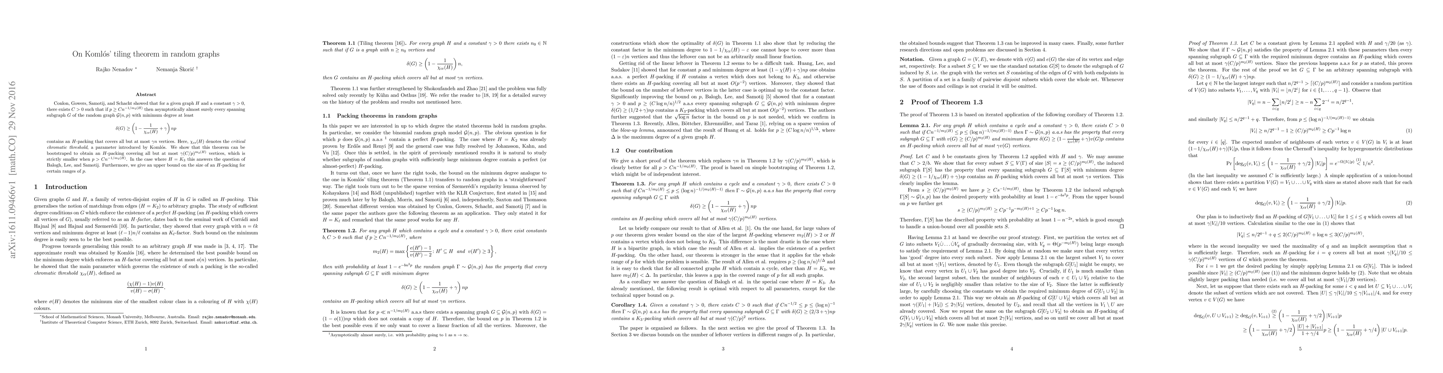 This paper extends Komlós' tiling theorem in random graphs by showing that a given graph $H$ can be packed in random graphs $\mathcal{G}(n,p)$ with higher efficiency, especially when $p > Cn^{-1/m_2(H)}$. It also provides an upper bound on the size of such $H$-packings for specific $p$ values.