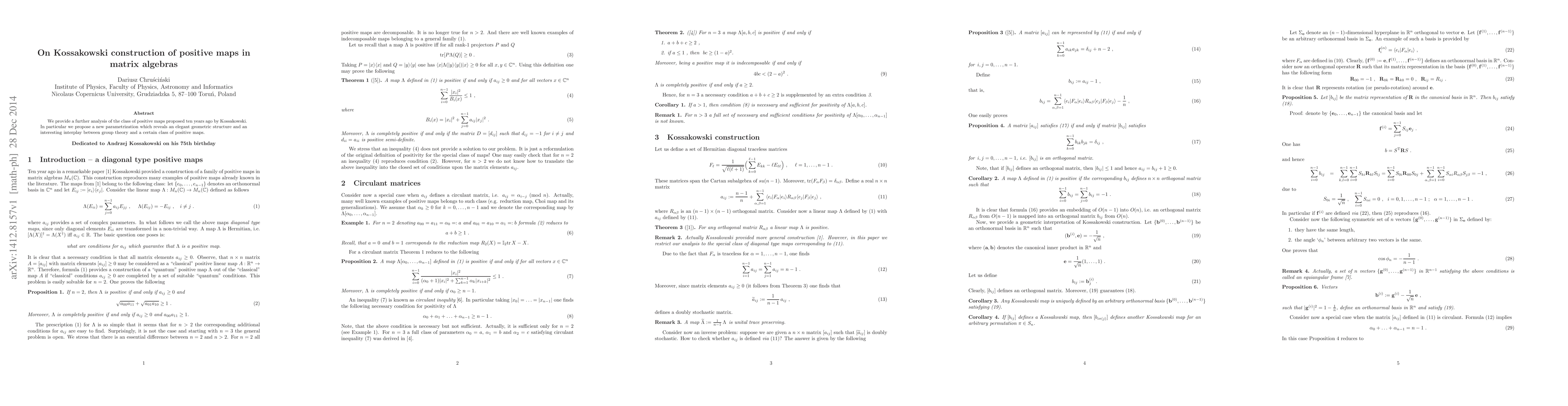 We provide a further analysis of the class of positive maps proposed ten years ago by Kossakowski. In particular we propose a new parametrization which reveals an elegant geometric structure and an interesting interplay between group theory and a certain class of positive maps.