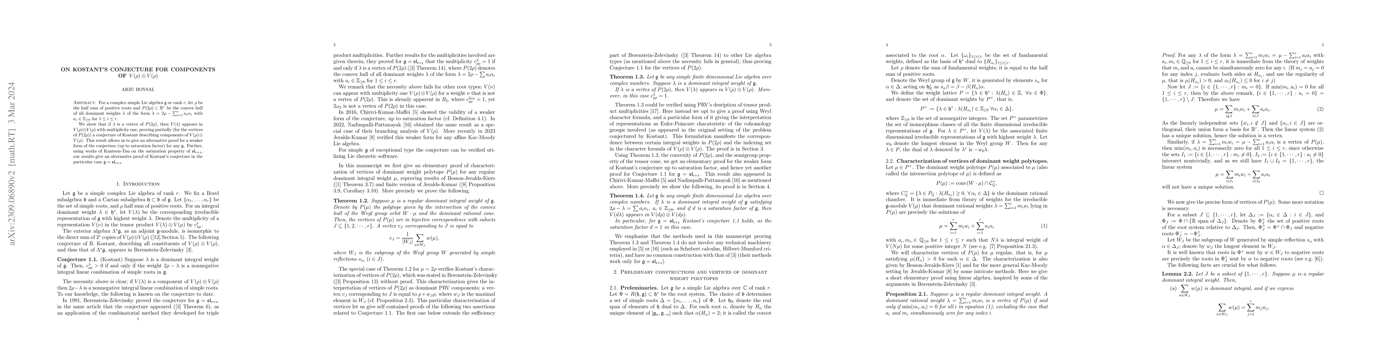 This paper proves that for a complex simple Lie algebra $\mathfrak{g}$, if $\lambda$ is a vertex of $P(2\rho)$, then $V(\lambda)$ appears in $V(\rho) \otimes V(\rho)$ with multiplicity one, partially verifying Kostant's conjecture for these components. It also provides an alternative proof for a weaker form of the conjecture and extends this result to $\mathfrak{sl_{r+1}}$ using Knutson-Tau's work.
