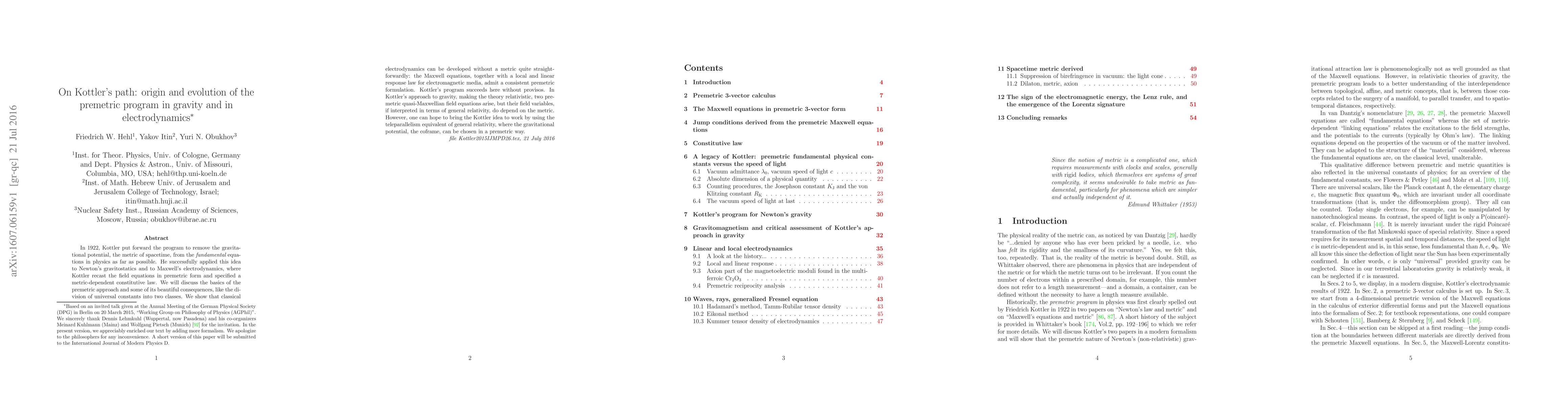 In 1922, Kottler put forward the program to remove the gravitational potential, the metric of spacetime, from the fundamental equations in physics as far as possible. He successfully applied this idea to Newton's gravitostatics and to Maxwell's electrodynamics, where Kottler recast the field equations in premetric form and specified a metric-dependent constitutive law. We will discuss the basics of the premetric approach and some of its beautiful consequences, like the division of universal constants into two classes. We show that classical electrodynamics can be developed without a metric quite straightforwardly: the Maxwell equations, together with a local and linear response law for electromagnetic media, admit a consistent premetric formulation. Kottler's program succeeds here without provisos. In Kottler's approach to gravity, making the theory relativistic, two premetric quasi-Maxwellian field equations arise, but their field variables, if interpreted in terms of general relativity, do depend on the metric. However, one can hope to bring the Kottler idea to work by using the teleparallelism equivalent of general relativity, where the gravitational potential, the coframe, can be chosen in a premetric way.