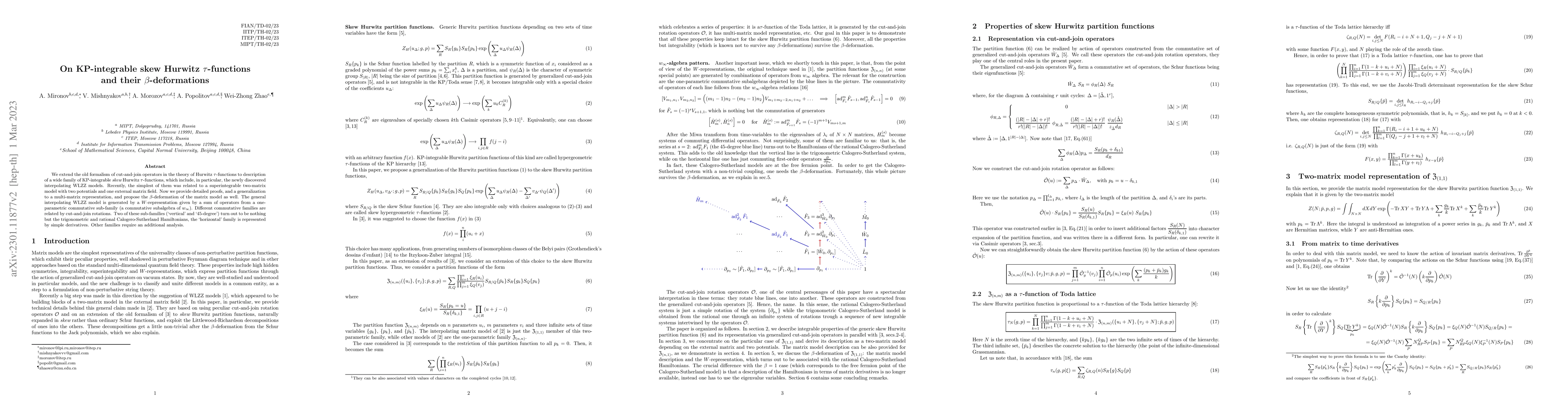 This paper extends the formalism of cut-and-join operators to describe KP-integrable skew Hurwitz $\tau$-functions, including newly discovered WLZZ models. It provides detailed proofs and proposes a $\beta$-deformation of a related superintegrable two-matrix model, with the general model generated by a $W$-representation involving commutative sub-families.
