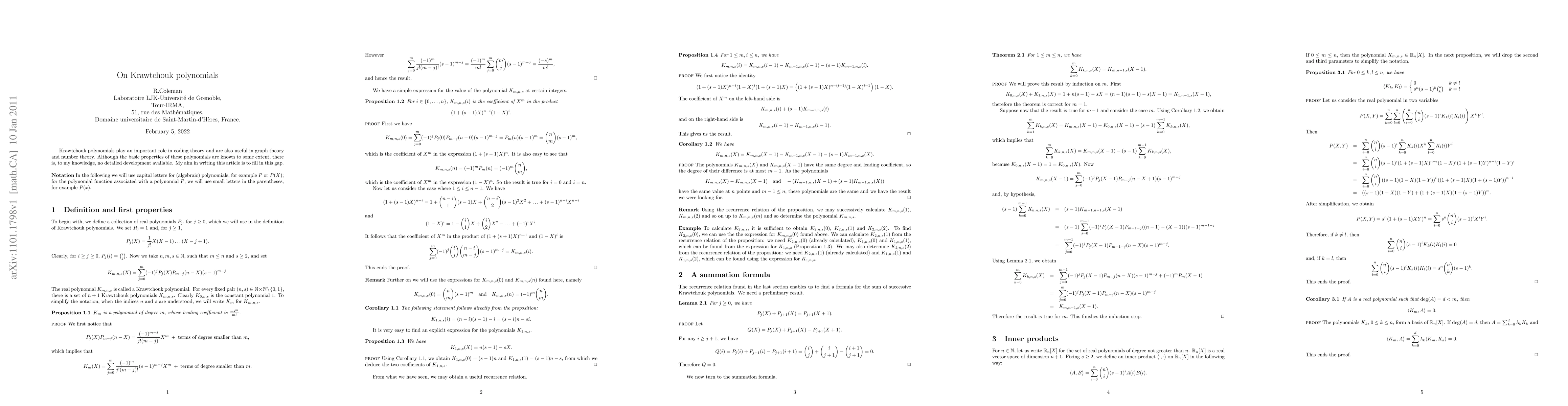 This paper aims to provide a detailed development of the properties of Krawtchouk polynomials, which are significant in coding theory, graph theory, and number theory, filling a gap in existing literature on the subject.