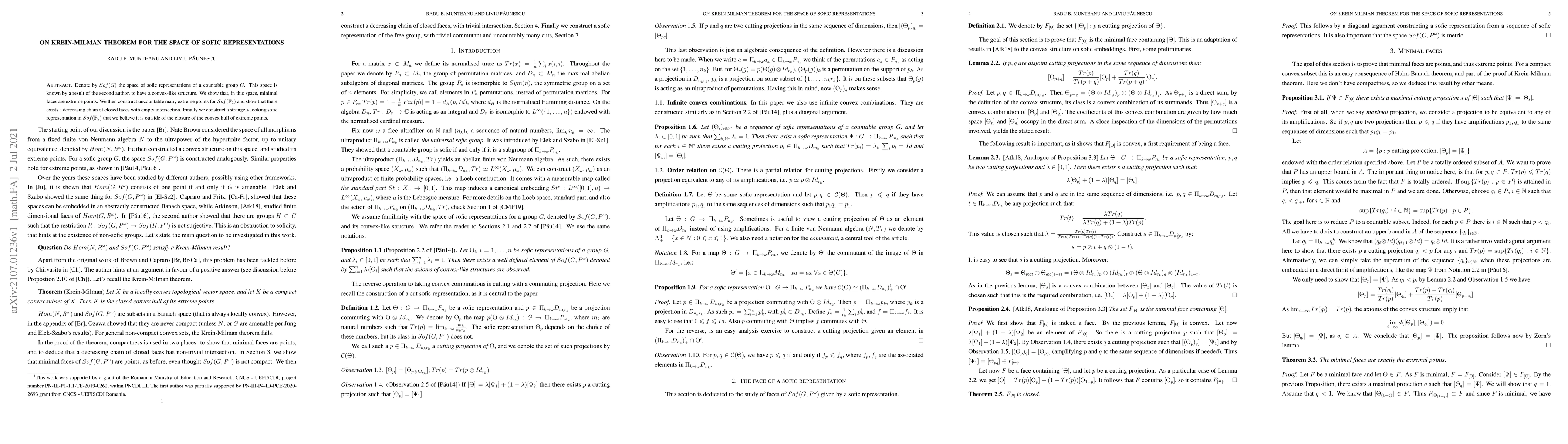 Denote by $Sof(G)$ the space of sofic representations of a countable group $G$. This space is known by a result of the second author, to have a convex-like structure. We show that, in this space, minimal faces are extreme points. We then construct uncountable many extreme points for $Sof(\mathbb{F}_2)$ and show that there exists a decreasing chain of closed faces with empty intersection. Finally we construct a strangely looking sofic representation in $Sof(\mathbb{F}_2)$ that we believe it is outside of the closure of the convex hull of extreme points.