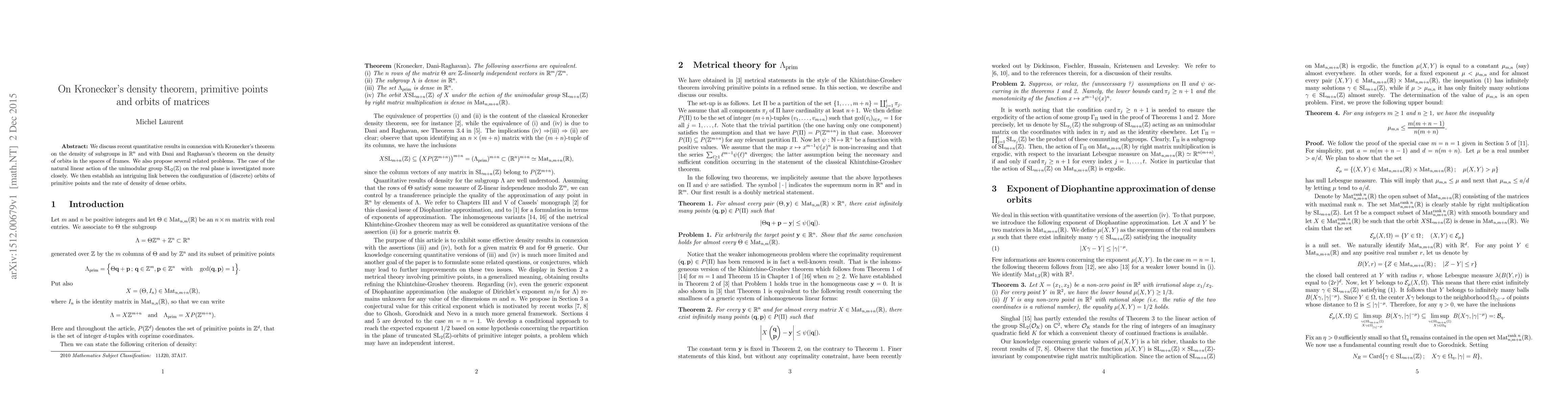 This paper explores recent quantitative advancements related to Kronecker's density theorem and Dani-Raghavan's theorem on orbit density, focusing on the unimodular group's action on the real plane. It establishes a connection between the configuration of primitive points' orbits and the rate of density of dense orbits.