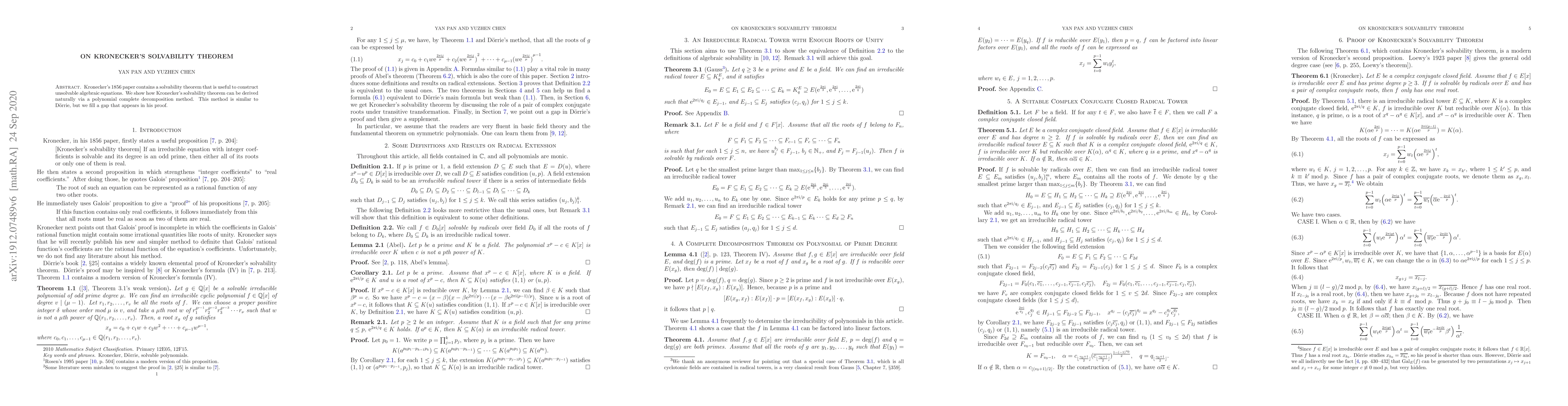 Kronecker's 1856 paper contains a solvability theorem that is useful to construct unsolvable algebraic equations. We show how Kronecker's solvability theorem can be derived naturally via a polynomial complete decomposition method. This method is similar to D\"orrie, but we fill a gap that appears in his proof.