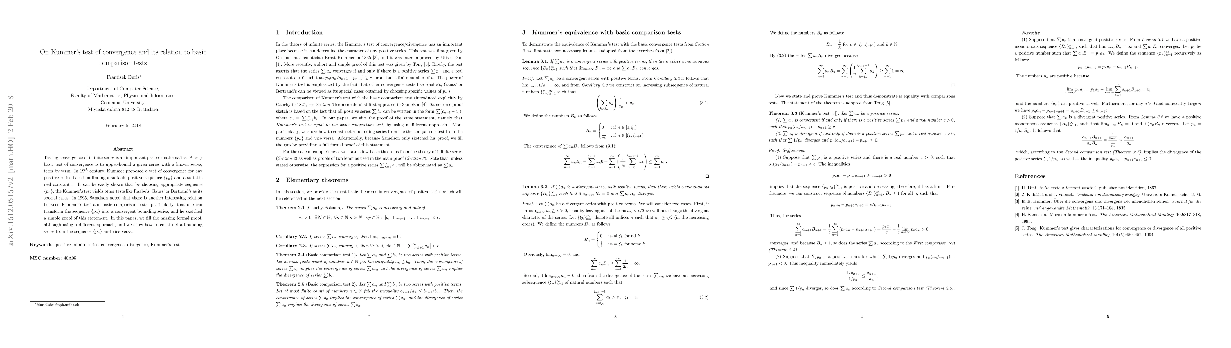This paper provides a formal proof of the relationship between Kummer's test for convergence of infinite series and basic comparison tests, demonstrating how to construct a bounding series from the sequence $\{p_n\}$ and vice versa, using a different approach than previously outlined.