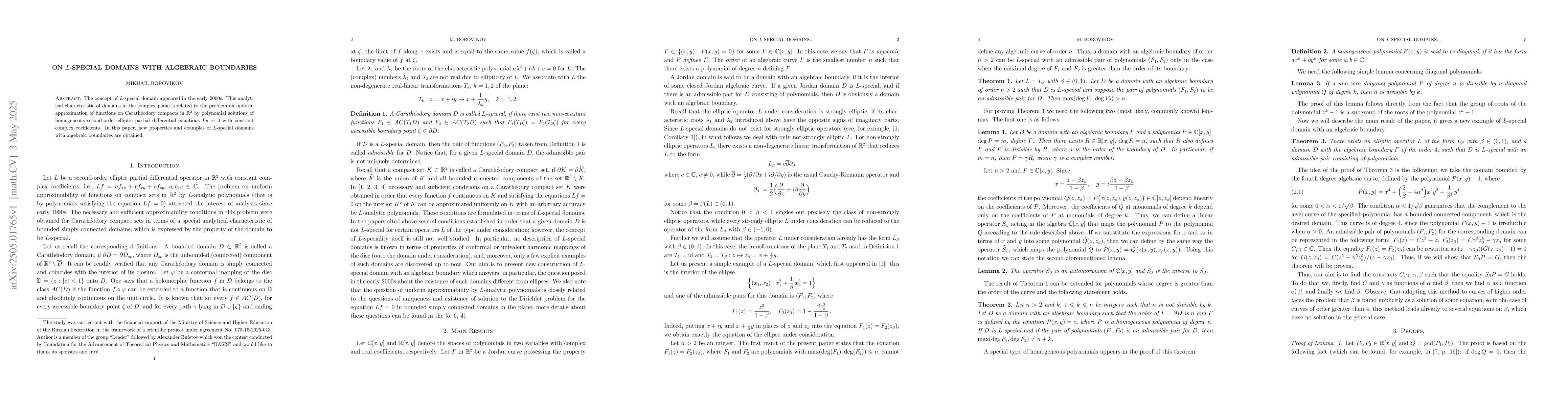 The concept of $L$-special domain appeared in the early 2000s. This analytical characteristic of domains in the complex plane is related to the problem on uniform approximation of functions on Carath\'eodory compacts in $\mathbb{R}^2$ by polynomial solutions of homogeneous second-order elliptic partial differential equations $Lu=0$ with constant complex coefficients. In this paper, new properties and examples of $L$-special domains with algebraic boundaries are obtained.