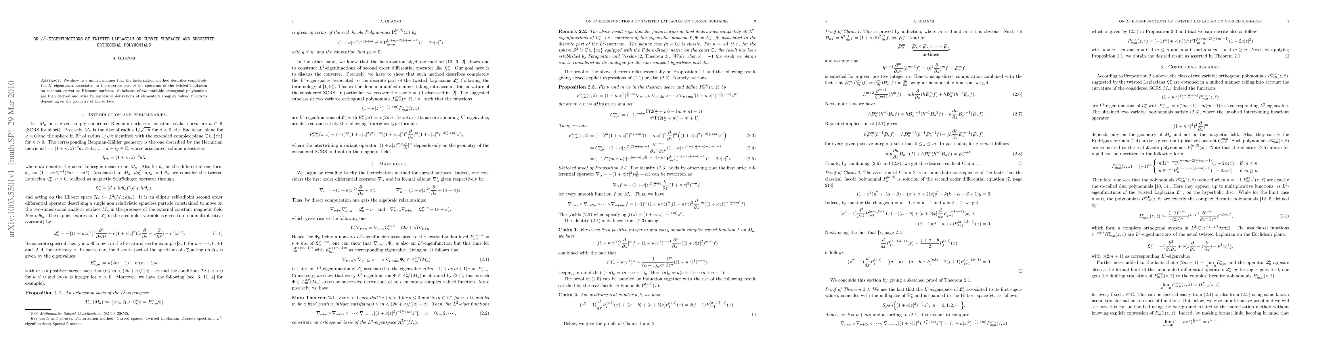 We show in a unified manner that the factorization method describes completely the $L^2$-eigenspaces associated to the discrete part of the spectrum of the twisted Laplacian on constant curvature Riemann surfaces. Subclasses of two variable orthogonal polynomials are then derived and arise by successive derivations of elementary complex valued functions depending on the geometry of the surface.