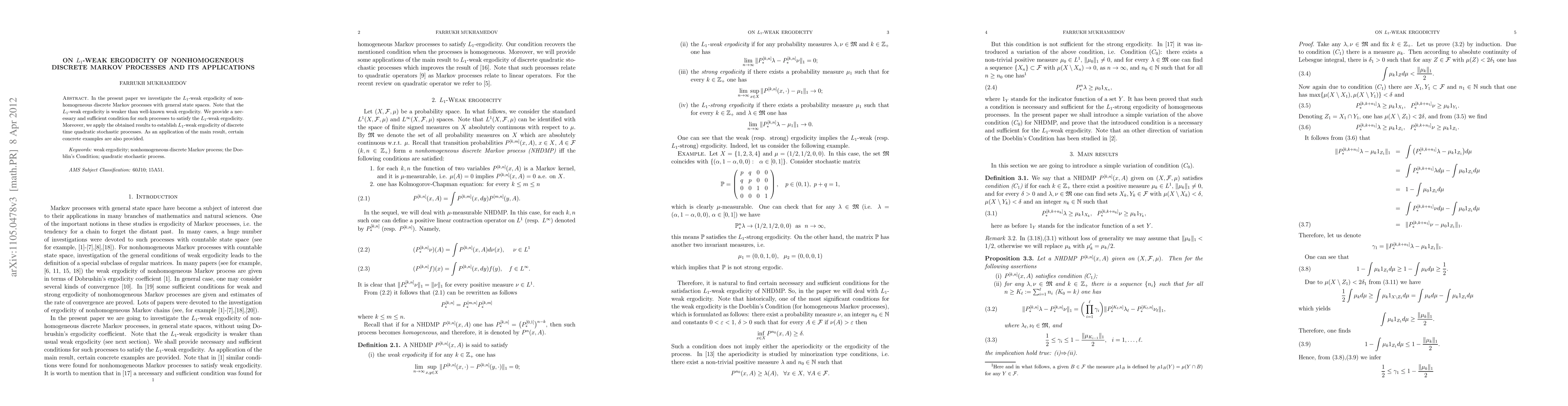 This paper presents a necessary and sufficient condition for the $L_1$-weak ergodicity of nonhomogeneous discrete Markov processes with general state spaces, which is a weaker criterion than traditional weak ergodicity. The findings are applied to discrete time quadratic stochastic processes, with concrete examples provided.