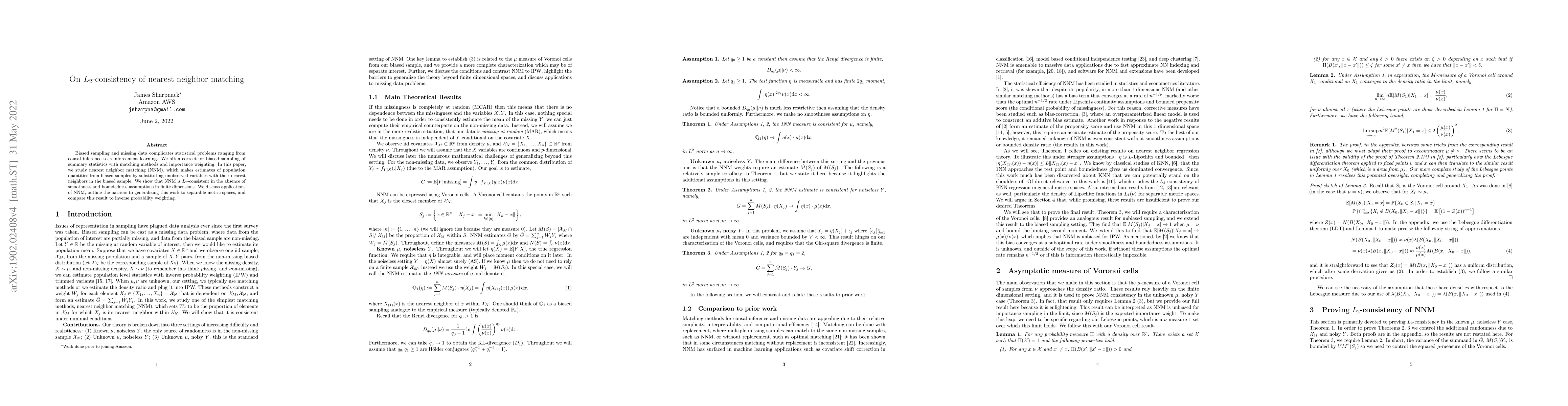 This paper demonstrates that nearest neighbor matching (NNM) is $L_2$-consistent without requiring smoothness or boundedness assumptions, highlighting its effectiveness in correcting biased samples. It also discusses the challenges in extending NNM to separable metric spaces and compares it to inverse probability weighting.