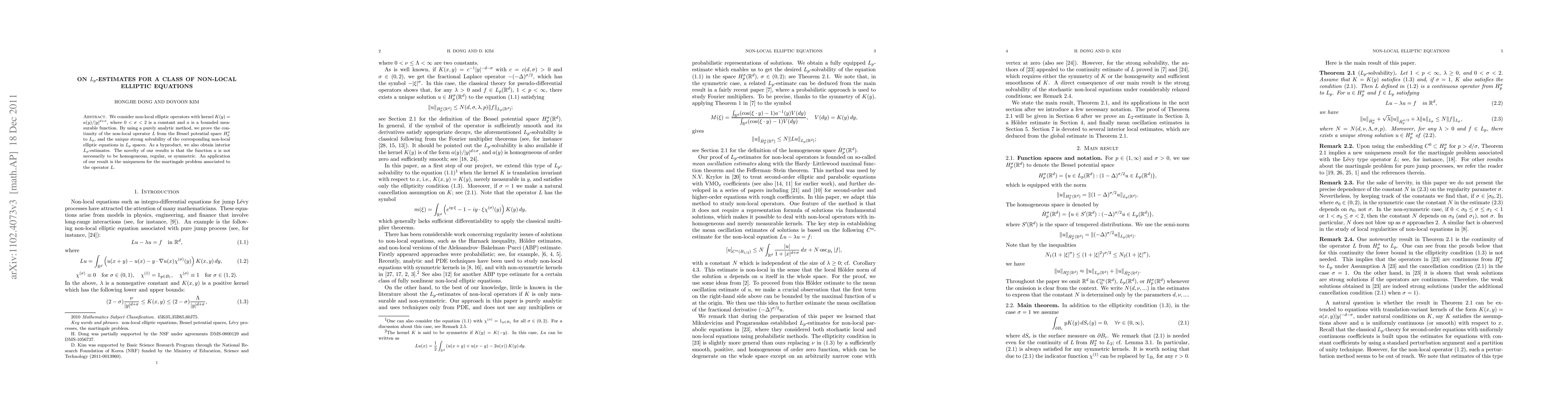 We consider non-local elliptic operators with kernel $K(y)=a(y)/|y|^{d+\sigma}$, where $0 < \sigma < 2$ is a constant and $a$ is a bounded measurable function. By using a purely analytic method, we prove the continuity of the non-local operator $L$ from the Bessel potential space $H^\sigma_p$ to $L_p$, and the unique strong solvability of the corresponding non-local elliptic equations in $L_p$ spaces. As a byproduct, we also obtain interior $L_p$-estimates. The novelty of our results is that the function $a$ is not necessarily to be homogeneous, regular, or symmetric. An application of our result is the uniqueness for the martingale problem associated to the operator $L$.