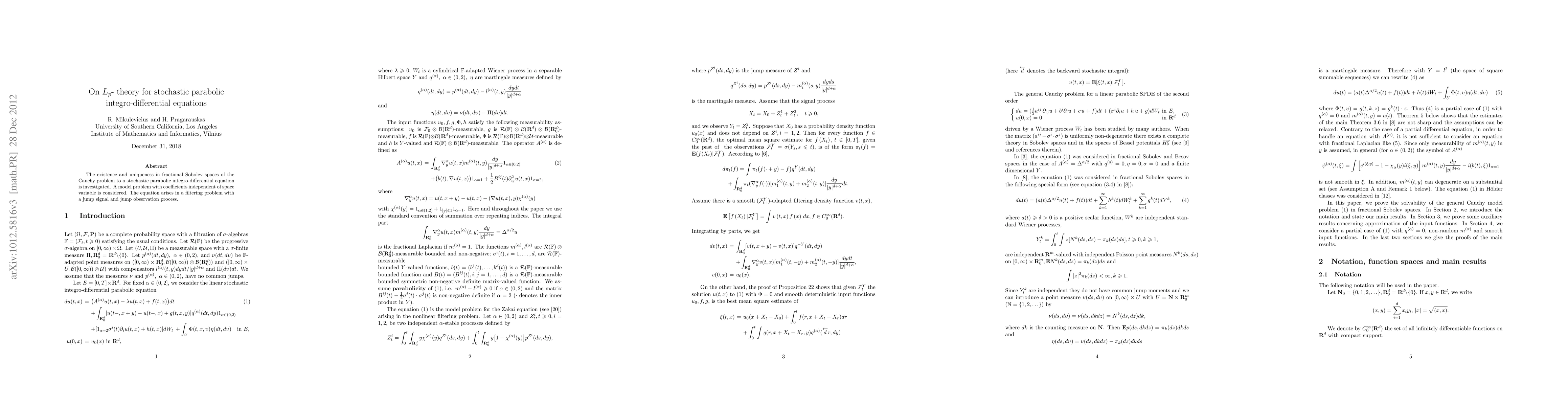 The existence and uniqueness in fractional Sobolev spaces of the Cauchy problem to a stochastic parabolic integro-differential equation is investigated. A model problem with coefficients independent of space variable is considered. The equation arises, for example, in a filtering problem with a jump signal and jump observation process.