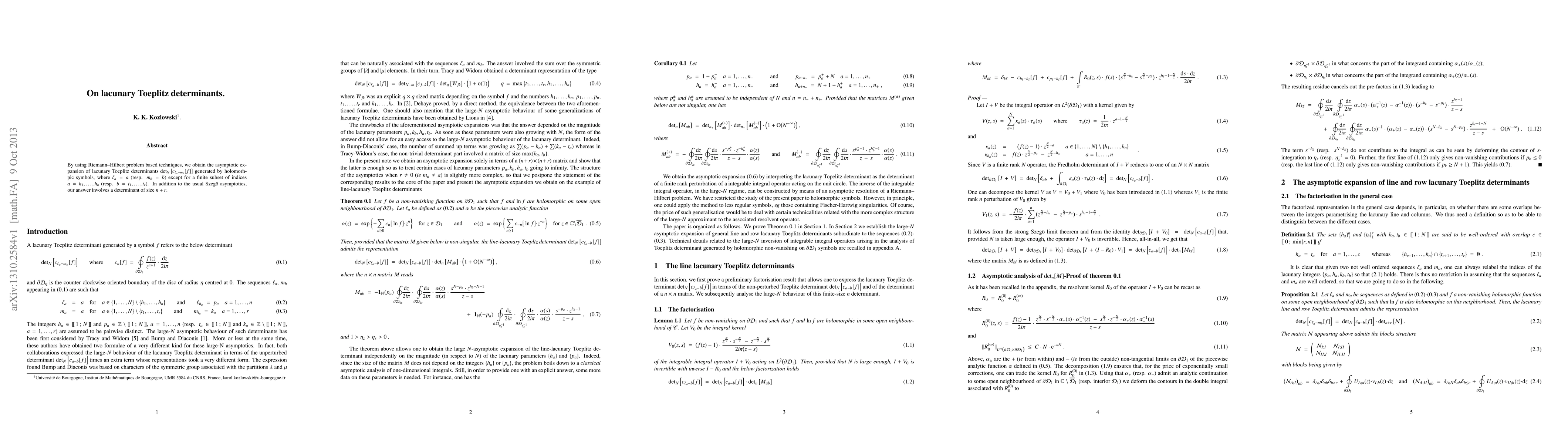By using Riemann--Hilbert problem based techniques, we obtain the asymptotic expansion of lacunary Toeplitz determinants $\det_N\big[ c_{\ell_a-m_b}[f] \big]$ generated by holomorhpic symbols, where $\ell_a=a$ (resp. $m_b=b$) except for a finite subset of indices $a=h_1,\dots, h_n$ (resp. $b=t_1,\dots, t_r$). In addition to the usual Szeg\"{o} asymptotics, our answer involves a determinant of size $n+r$.