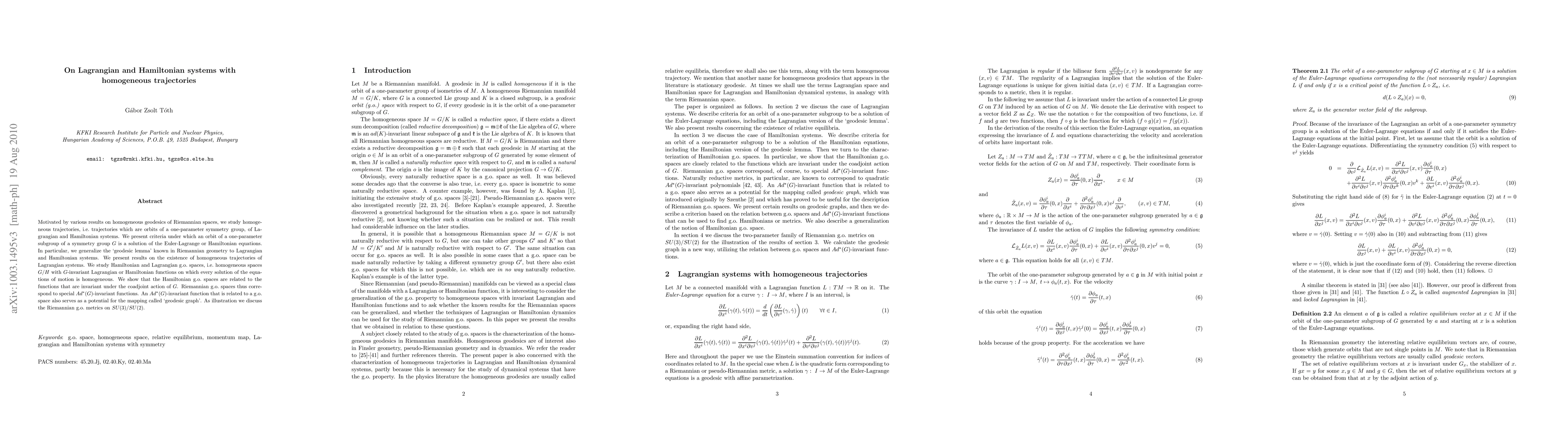 This paper explores homogeneous trajectories in Lagrangian and Hamiltonian systems, extending the geodesic lemma to these contexts. It identifies conditions for orbits of symmetry groups to solve Euler-Lagrange or Hamiltonian equations and discusses the existence of such trajectories in Lagrangian systems, alongside the study of Hamiltonian and Lagrangian g.o. spaces.