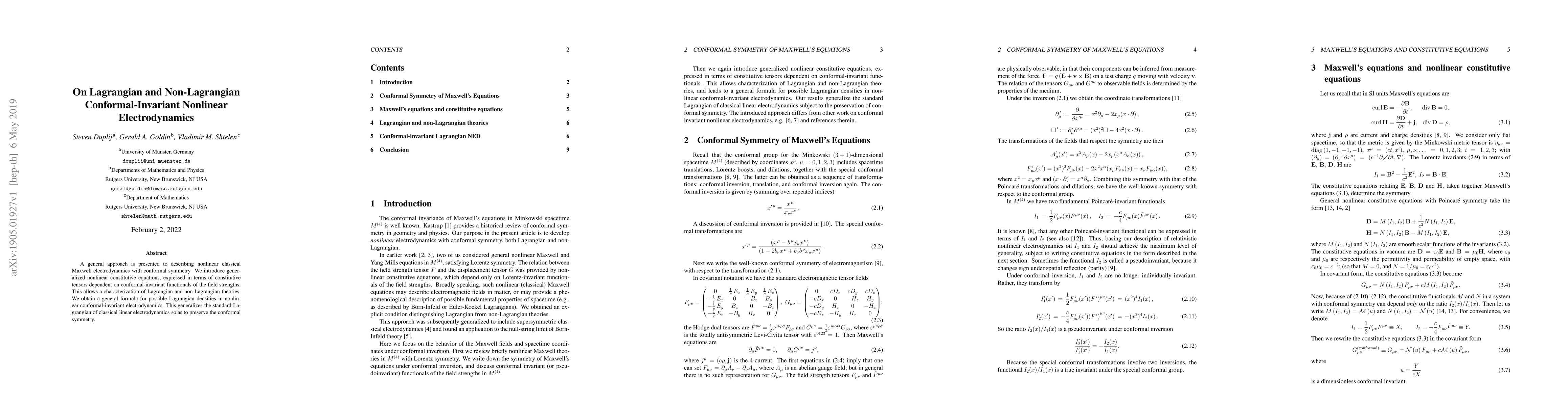 This paper proposes a method for describing nonlinear classical Maxwell electrodynamics with conformal symmetry, introducing generalized constitutive equations that characterize both Lagrangian and non-Lagrangian theories, and deriving a general formula for Lagrangian densities that preserve conformal symmetry.