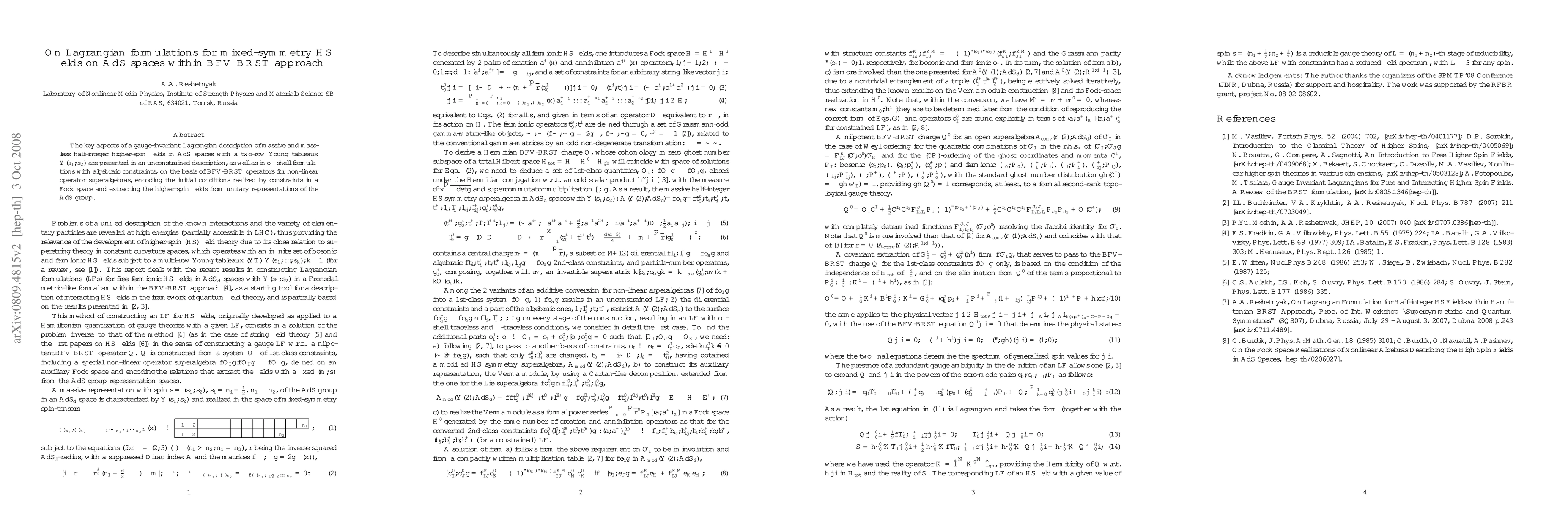 The key aspects of a gauge-invariant Lagrangian description of massive and massless half-integer higher-spin fields in AdS spaces with a two-row Young tableaux $Y(s_1,s_2)$ are presented in an unconstrained description, as well as in off-shell formulations with algebraic constraints, on the basis of BFV-BRST operators for non-linear operator superalgebras, encoding the initial conditions realized by constraints in a Fock space and extracting the higher-spin fields from unitary representations of the AdS group.