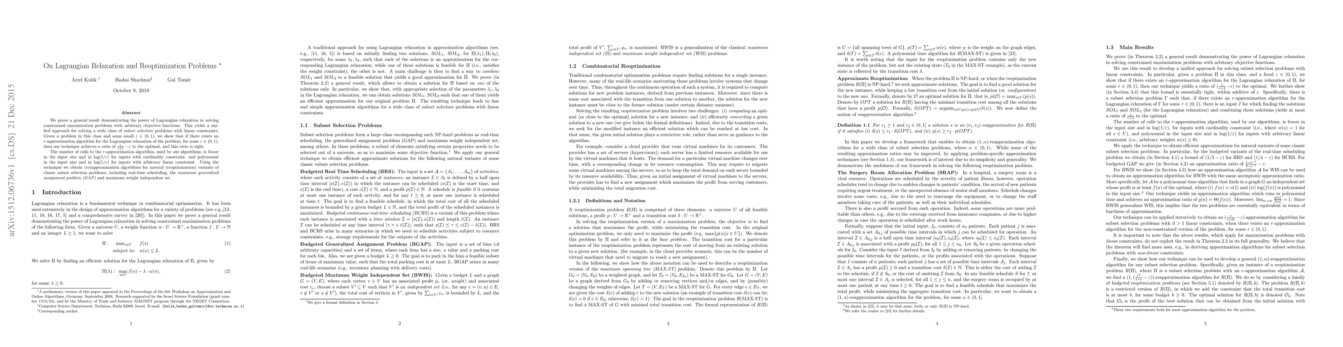 We prove a general result demonstrating the power of Lagrangian relaxation in solving constrained maximization problems with arbitrary objective functions. This yields a unified approach for solving a wide class of {\em subset selection} problems with linear constraints. Given a problem in this class and some small $\eps \in (0,1)$, we show that if there exists an $r$-approximation algorithm for the Lagrangian relaxation of the problem, for some $r \in (0,1)$, then our technique achieves a ratio of $\frac{r}{r+1} -\! \eps$ to the optimal, and this ratio is tight. The number of calls to the $r$-approximation algorithm, used by our algorithms, is {\em linear} in the input size and in $\log (1 / \eps)$ for inputs with cardinality constraint, and polynomial in the input size and in $\log (1 / \eps)$ for inputs with arbitrary linear constraint. Using the technique we obtain (re)approximation algorithms for natural (reoptimization) variants of classic subset selection problems, including real-time scheduling, the {\em maximum generalized assignment problem (GAP)} and maximum weight independent set.