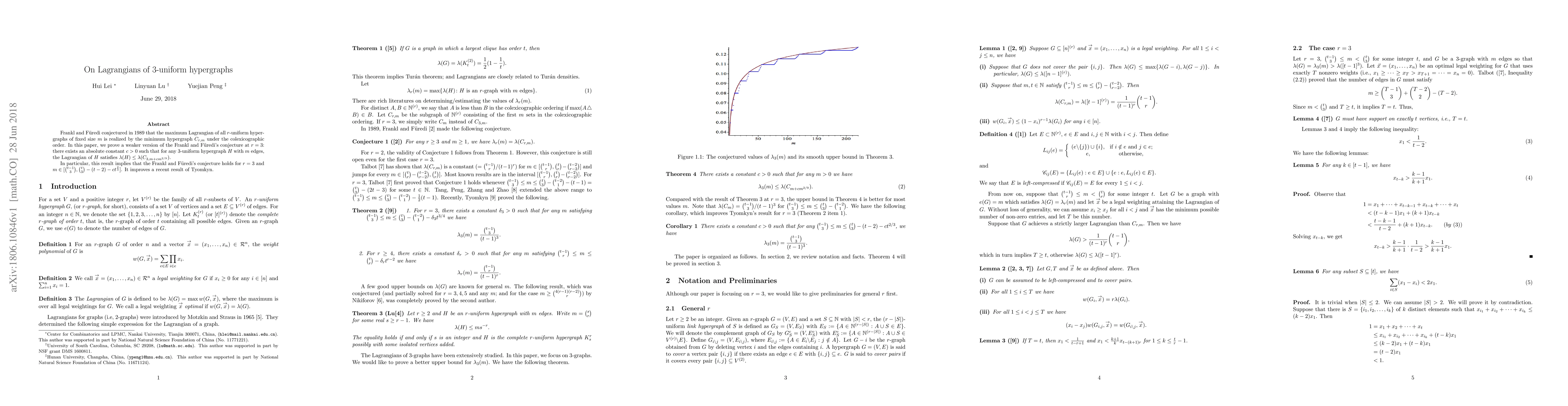 This paper proves a weaker version of the Frankl and Fűredi conjecture for $3$-uniform hypergraphs, showing that for any such hypergraph with $m$ edges, its Lagrangian is bounded above by that of a specific hypergraph $C_{3,m+cm^{2/9}}$, with $c>0$ being an absolute constant. This result confirms the conjecture for $r=3$ within a specified range of $m$ values.